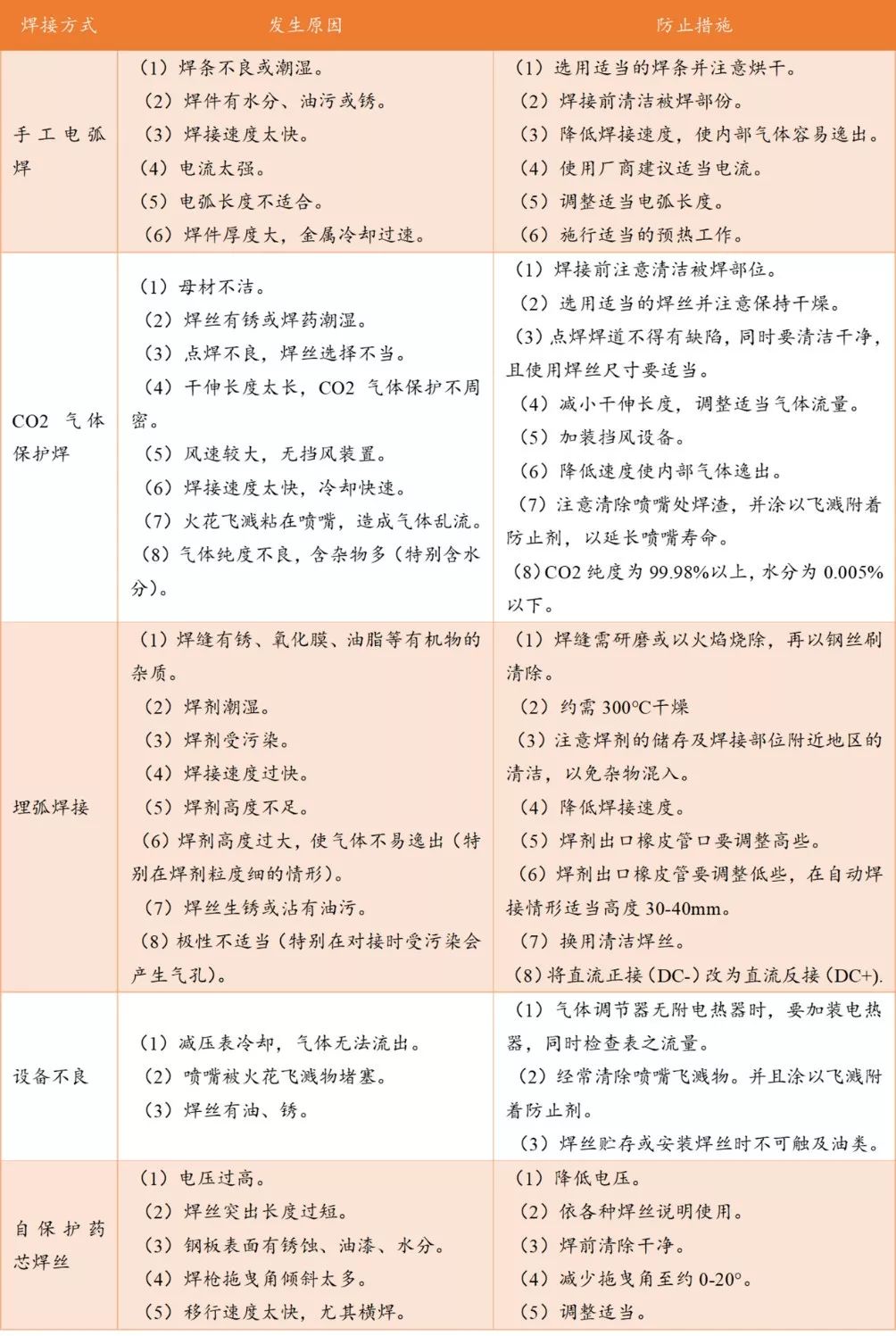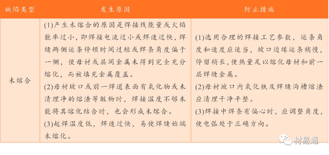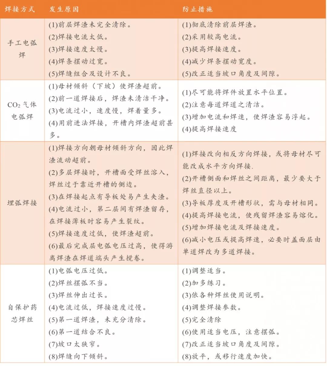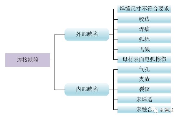7.引起失效的常见缺陷 金属焊接缺陷 焊接缺陷的种类很多,按其在焊缝中所处的位置可分为外部缺陷和内部缺陷两大类。外部缺陷也叫外观缺陷。外部缺陷位于焊缝表面,借用肉眼或低倍放大镜就能观察到。内部缺陷位于焊缝的内部,必须应用破坏性检验或专门无损检验方法才能发现。 焊接缺陷分类 焊接区域示意图 焊缝尺寸不符合要求 焊缝尺寸不符合要求包括:焊缝外形高低不平、焊道宽窄不齐、焊缝余高过大或过小、焊缝宽度太宽或太窄、焊缝和母材之间的过渡不平滑等。 原因分析:(1)焊缝坡口角度、宽度及组装间隙不统一。(2)焊条直径选择不当,造成填充层过高,失去坡口轮廓线,使盖面宽窄不一,焊缝过高,波纹粗劣。(3)背面清根刨缝质量差,焊道宽度不一。(4)焊接电流过大或过小,运条手法和角度不当以及焊速不均匀。 危害性:尺寸过小的焊缝,会降低焊接接头的强度;尺寸过大的焊缝,不仅浪费焊接材料,也会增大焊接结构的变形。焊缝金属向母材的过渡处若不平滑,出现尖角,会造成应力集中,降低焊接结构的承载能力。 预防措施:(1)采用自动和半自动切割机或刨边机加工坡口。(2)焊缝组对间隙应控制在标准规范要求值以内,背面用碳弧气刨清根后,采用砂轮修整刨槽及碳化层,使刨槽宽窄一致。(3)选用适当的焊接电流和焊条直径,遵守焊接工艺,熟练掌握操作技术,保持焊速均匀;手工焊操作人员要熟练地掌握运条速度和焊条角度,以获得成形美观的焊缝。 咬边 咬边也称“咬肉”,是电弧或火焰将焊缝边缘的母材熔化后,没有得到填充金属的补充,而留下的凹陷或凹槽。咬边是一种危险的缺陷,它不但减小了基本金属的有效工作截面,而且在咬边处还会造成应力集中。咬边又是一种常见的缺陷,应该特别引起注意。 焊瘤 熔化金属流淌到焊缝以外未熔化的母材上形成金属瘤。该处常伴有局部未熔合,有时也称满溢。习惯上,还常将焊缝金属的多余疙瘩部分称为焊瘤。焊瘤处应力集中,还易伴生裂缝等缺陷;焊瘤也破坏了焊缝平整光滑的外形,管子内部的焊瘸,除降低强度外,还减小管道的有效截面,造成堵塞观象。 原因分析:(1)坡口边缘污物未清理干净;电流过大,熔池温度过高,使液体金属凝固较慢,在自重的作用下下坠而成;焊接速度太慢以及组对间隙太大等。(2)运条角度不当,操作不熟练。焊速过慢也极易产生焊瘤。 预防措施:(1)焊接前应彻底清理坡口及其附近的脏物;组对间隙要合适;选择适当的焊接电流和运条角度,熟练掌握操作技术,保持焊速均匀。(2)碱性焊条采用短弧焊接,极性反接。 弧坑 弧坑是焊接时,由于断弧和收弧不当,在焊道末端形成的低洼部分,表面低凹深度大于0.5mm以上。弧坑低于基本金属表面,降低了焊接接头的承载能力,而且弧坑内常伴有气孔、夹渣、微裂纹等缺陷。 弧坑是由焊缝熔池金属未填足,熄弧过快或电流过大(薄板时)而造成。预防措施:收弧过程中,焊条要在收弧处作短暂的停留或作回焊运条,使电弧不要突然熄灭、使焊条金属填满熔池。 飞溅 手工焊接时,在焊缝及其两侧母材上产生一般性飞溅和严重性熔合飞溅。一般性飞溅是手工焊接常见的焊接质量通病;但产生严重性熔合性飞溅,其危害甚大,它会增加母材局部表面淬硬组织,易产生硬化发生脆裂及加速局部腐蚀性等缺陷。 弧疤 电弧擦伤也叫弧疤或弧斑,多是由于偶然不慎使焊条或焊把与焊接工件接触,或地线与工件接触不良短暂地引起电孤,而在焊接工件表面留下的伤痕,形成许多小圆孔和凹坑。 电弧擦伤处由于电弧的短暂引燃与急速熄灭,冷却速度快,在易淬火钢及低温钢的工件上,会形成脆性淬硬组织,可能成为脆性破坏的起源点。在不锈钢等有耐腐蚀性能要求的工件上,电弧擦伤会成腐蚀的起始点,降低材料的性能。 原因分析:操作不慎,使焊条或焊把裸露部分与非焊接部位接触,短暂地引起电弧,将母材表面擦伤,形成许多小圆孔和凹坑。 预防措施:(1)精心操作,避免带电的焊条或焊把裸露部分与非焊接区域母材相碰引起电弧。(2)不得在非焊接部位随意引弧或试电流,引弧应在引弧板上或在焊道破口内进行。(3)地线与母材应紧固良好。 气孔 气孔是焊接熔池中气体在凝固时未能逸出,而残留在焊缝中所形成的空穴。根据孔穴产生的部位,可分为外部气孔和内部气孔;根据分布情况,气孔又可分为单个气孔、连续气孔和密集气孔等。存在于焊缝内的气孔,减小了金属的有效截面,从而使焊接接头的强度降低;气孔的边缘可能发生应力集中,密集气孔使焊缝组织疏松,使接头的塑性降低;贯通性气孔破坏了焊缝的致密性,造成渗漏。焊缝中的氢气孔还有可能导致裂缝的产生和扩展。 夹渣 夹渣是焊后残留在焊缝中的熔渣,有的夹在焊缝内部,有的夹在表面沟槽内。 焊缝中的夹渣,降低了接头的承载能力,容易引起应力集中;影响了焊缝金属的致密性,还可能造成焊缝的渗漏,由于夹杂物与焊缝金属的线膨胀系数相差悬殊,温度剧烈变化时,有可能产生较大应力而导致裂缝。 未焊透 未焊透是焊接时接头根部未完全熔化而留下的间隙的现象。 未焊透降低了接头的机械性能,同时由于未焊透部位的缺口及末端会产生严重的应力集中,导致产生裂缝。 未熔合 未熔合是指焊缝金属和母材之间或焊道金属和焊道金属之间未完全熔化和结合的部分,它可以分为侧壁未熔合、层间未熔合和焊缝
