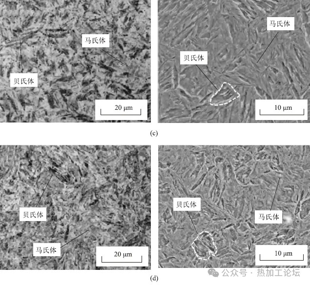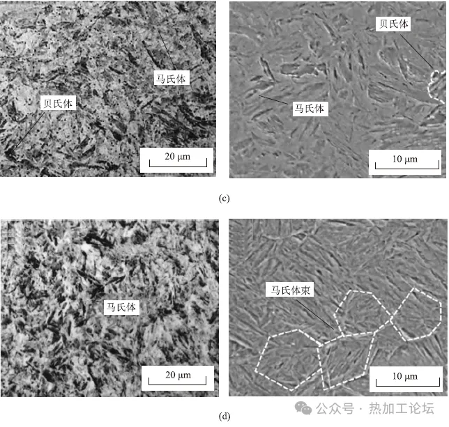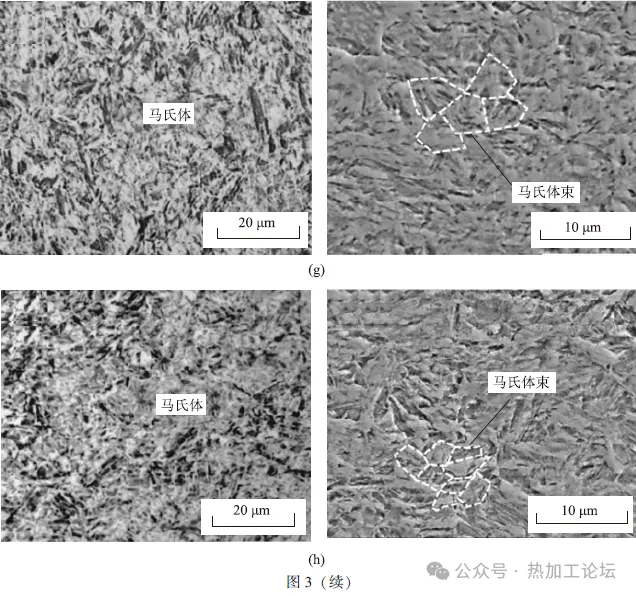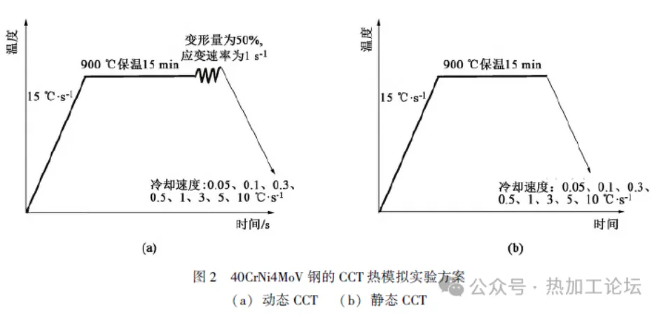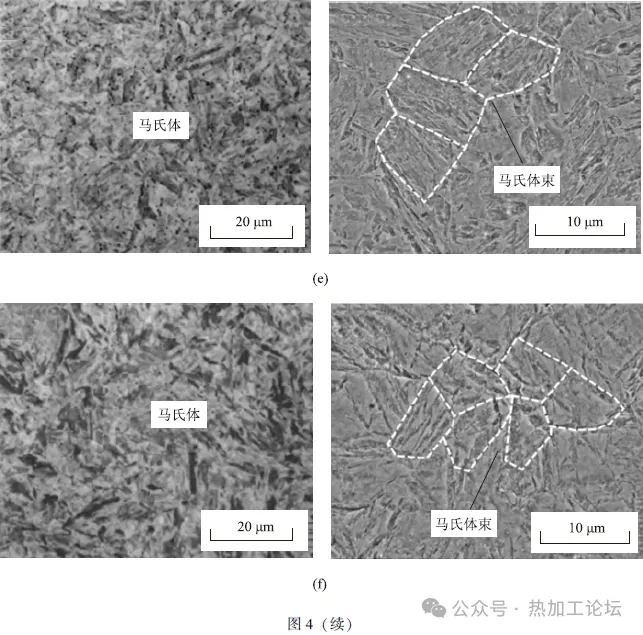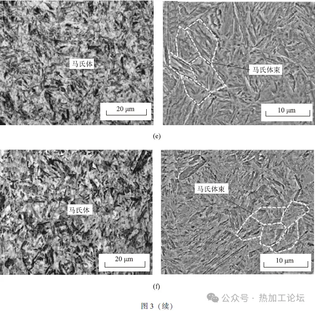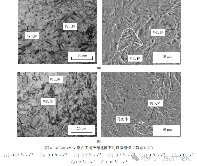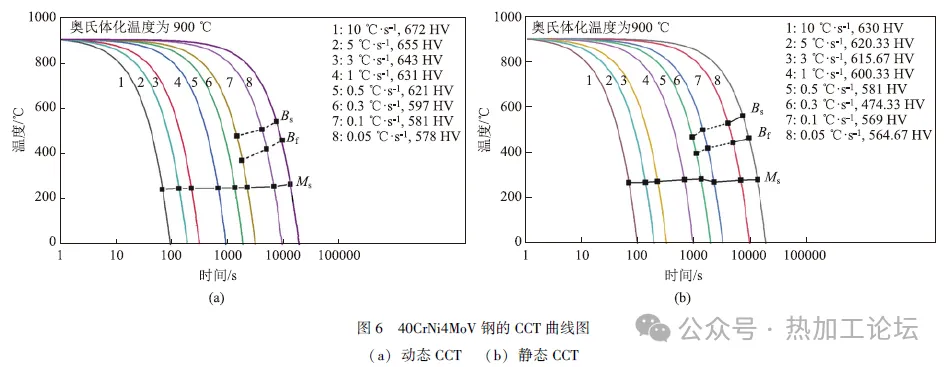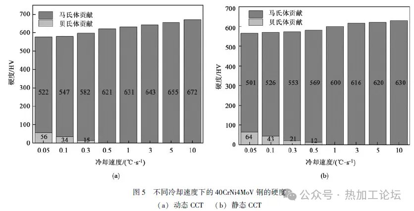 (3) 在相同的冷却速度下, 奥氏体变形促使40CrNi4MoV钢试样在连续冷却后的组织硬度明显增加。以0.5℃·s-1的冷却速度为例,动态连续冷却能够促使材料完全转化为马氏体,此时其显微硬度达到621HV。相较之下,静态连续冷却则需1.0℃·s-1的速度来完成全马氏体转化,然而其显微硬度仅为600 HV。奥氏体形变引发的再结晶细化效应,不仅使冷却后的马氏体更加细小,还增加了内部的位错密度,进而显著提高了40CrNi4MoV钢的整体硬度。