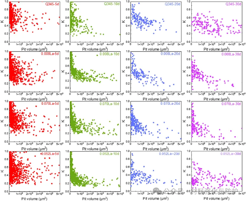 不同型钢经不同周期循环腐蚀后的K值及个别腐蚀坑的分布,每个点代表腐蚀坑的K值和体积