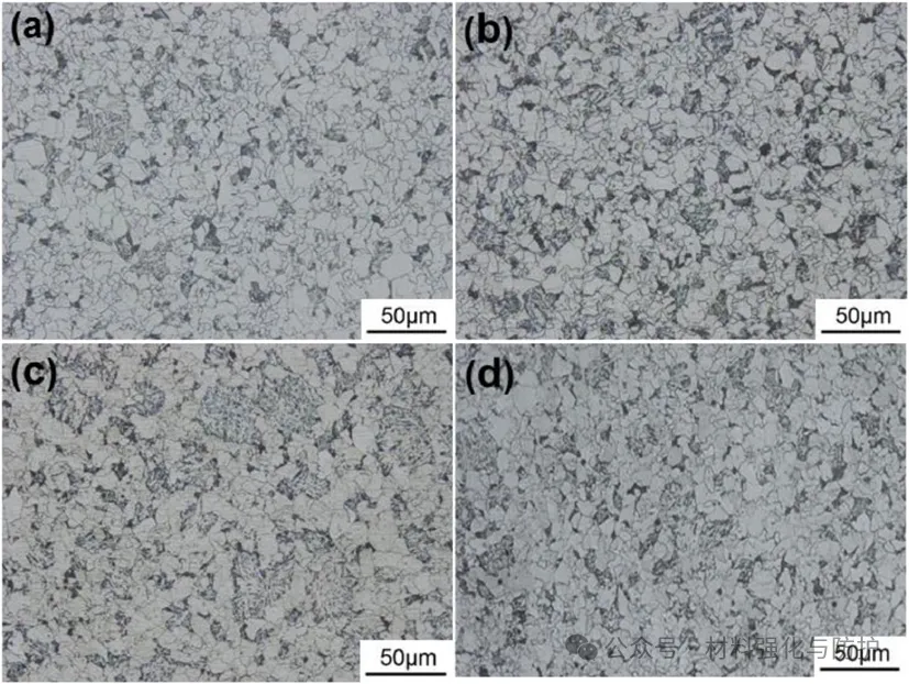 不同La含量的四种钢的光学显微组织:(a) Q345, (b) 0.008La, (c) 0.052La, (d) 0.070La