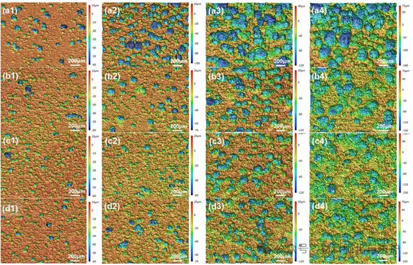 各种钢材经过不同周期循环腐蚀后的三维腐蚀图像:(a) Q345, (b) 0.008La, (c) 0.052La, (d) 0.070La。下标1-4分别代表5、10、20和30天