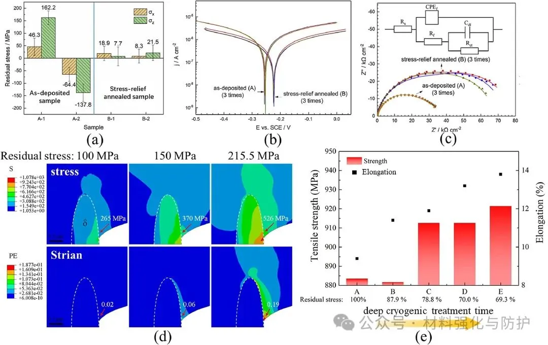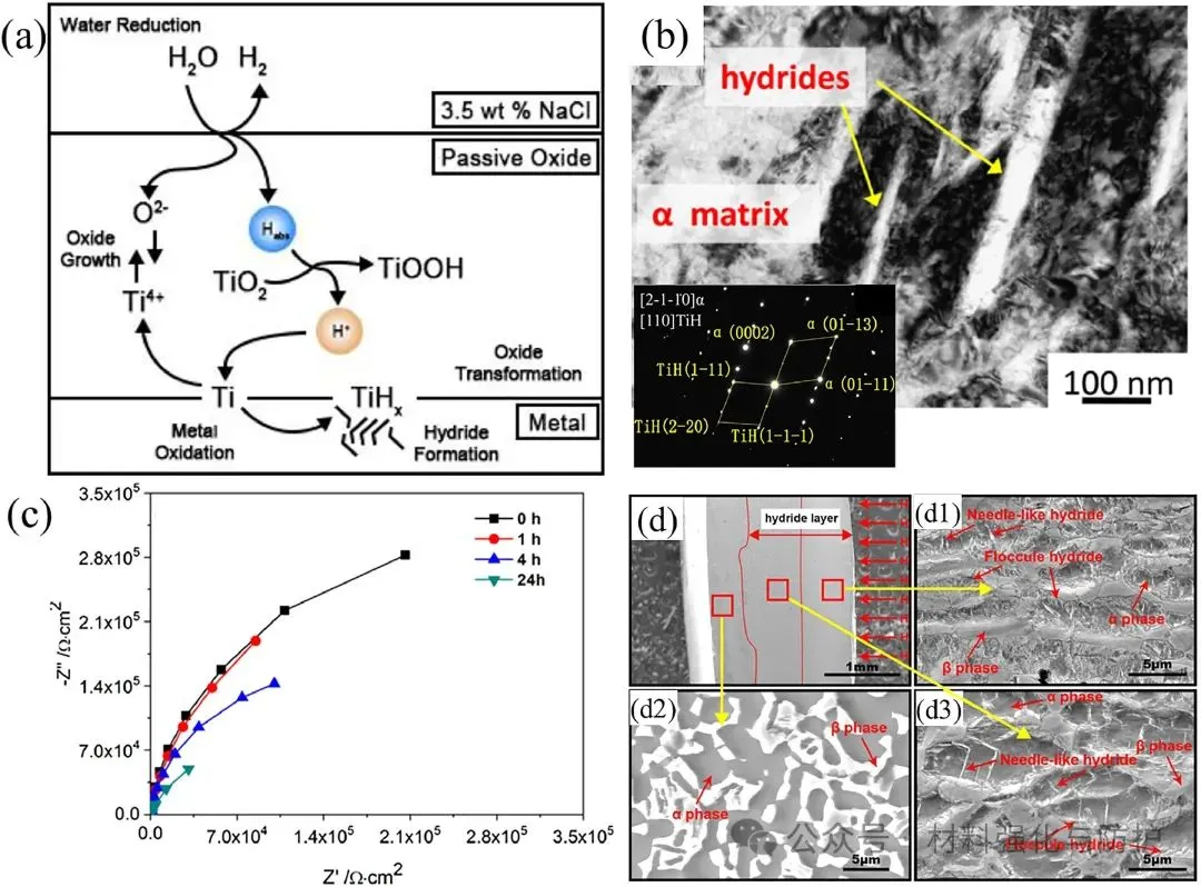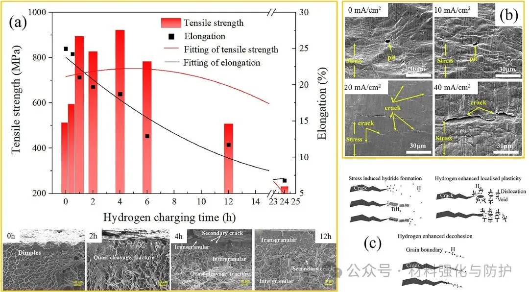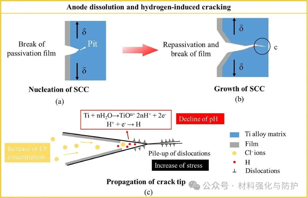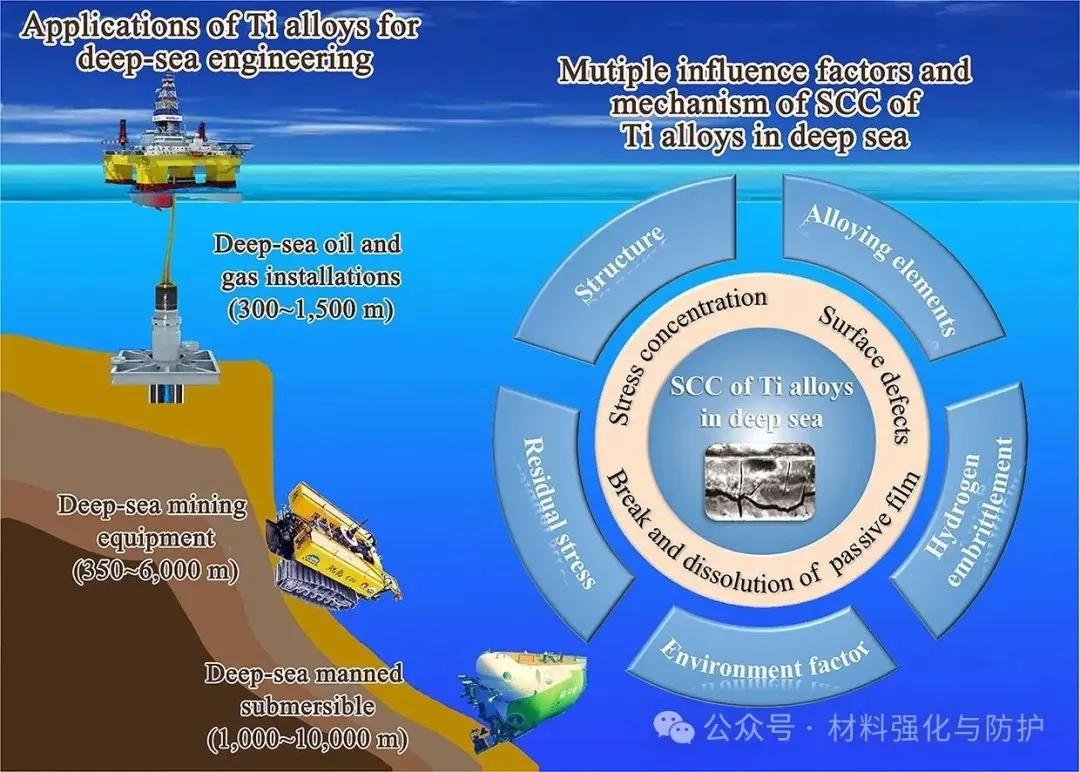 海洋蕴藏储量巨大的资源,人类对于海洋的开发还远远没有触及海洋的极限,近年来随着各类高强结构材料的发展,以及世界各国对资源的需求持续增加,各国都开始将海洋资源的开发不断向深蓝推进,开拓深海资源开采平台,也正因如此,用于深海装备的金属材料正面临前所未有的挑战。在众多合金体系中,钛合金凭借其体系普遍具有的高比强度,优异的耐蚀性和海水兼容性,在深海装备金属材料领域脱颖而出。 即便如此,当钛合金面对复杂极端的深海环境时,面对高静水压、低温、低溶解氧、低pH等问题的同时挑战,钛合金也难以避免的出现局部腐蚀与应力腐蚀(SCC)等时效隐患,这些隐患就如同定时炸弹般威胁着深海装备的长期服役稳定性。洛阳船舶材料研究所副总工程师及海洋腐蚀与防护国家重点实验室副主任孙明先研究员团队聚焦于这一关键问题在《Journal of Materials Science & Technology》发表综述论文,全面评估钛合金在深海环境中的应力腐蚀行为、微观机制及其影响因素,提出未来研究重点与防护策略建议。 【研究背景】 近年来,各国在海洋领域的竞争已从近海逐渐扩宽到了远洋深海,在那些海洋的地步,丰富的石油、天然气以及矿产等资源对每个国家而言都是极其重要的战略资源。但深海的“宝藏”并不是那么好开采的,要想得到这些资源,开采所用的设备就必须能够克服高压、低温、高盐度、低溶解氧等诸多恶劣环境因素,这些因素任一一种都是对材料的直接威胁,但深海金属设备却要同时面对它们,这也对深海设备的材料研究提出了新的挑战。 与其他常用的耐腐蚀材料相比,钛合金有更好的抗点蚀、缝隙腐蚀和晶间腐蚀的能力,在高速流动的海水中也依然能保持优异的耐蚀性,且其在海水和空气中的疲劳极限没有显著差异,也正因如此,钛合金也被誉为是海洋金属。在深海装备需求迅速增加的当下,钛合金再次成为广泛研究的热点,但与浅水环境中的优异表现不同,深海的各种恶劣环境同时作用下钛合金的钝化性能也被大幅削弱,从而导致局部腐蚀的风险,尤其是应力腐蚀造成材料开裂。焊接、加工等后处理过程产生的结构缺陷和内应力,以及与腐蚀电化学的协同作用,是造成钛合金深海应力腐蚀的重要因素。因此,随着深海设备对结构材料需求的增加,了解钛合金在深海环境中的腐蚀行为和主要使用性能对深海工业应用材料的设计至关重要。 (a)世界深海海洋矿石资源的位置;(b)海水的温度、DO含量、pH和盐度随深度的变化;(c)用钛合金制造的载人潜水器;(d)船用设备用钛合金压壳、管道、水泵 【核心内容】 该综述归纳总结了钛合金在深海应用中可能出现的应力腐蚀问题,并系统讨论了包括深海环境因素在内的应力腐蚀机理和影响因素,围绕钛合金的材料分类、结构应用、腐蚀规律与应力作用下的失效机制,系统梳理已有研究成果,明确当前知识空白与技术挑战,同时分析了钛合金在深海中腐蚀电流密度、钝化膜阻抗等性能随环境因子的变化趋势,强调了微观组织(如魏氏组织、晶界构型)、残余应力与氢脆行为在深海SCC中的关键作用。 图形摘要 【综述内容】 ① 深海腐蚀加速钝化膜失稳 现有研究表明,在模拟深海环境中,钛合金的钝化膜出现明显失稳,例如Ti6321合金的腐蚀电流密度显著上升,而钝化膜阻抗下降至浅海环境下的三分之一不到,主要原因是由于深海环境中的低溶解氧含量使得钛合金表面的钝化膜中高价氧化物含量大幅下降,而这些氧化物又恰好是钝化膜维持稳定的重要组分之一。 海洋工程用钛及其合金在NaCl溶液、海水和HCl溶液中的腐蚀电流密度和无源膜阻抗值数据根据文献计算 ② 热处理改善腐蚀抗力,但效果依组织类型而异 对Ti6321、TC4等多种钛合金开展系统热处理研究发现,魏氏组织具有最高的钝化膜阻抗与最低的腐蚀电流密度,显著优于等轴晶组织。 不同状态下Ti6321合金钝化膜在NaCl溶液和海水中的阻抗值,数据由文献计算得到 ③ SCC萌生与扩展机制:阳极溶解与氢脆并存 有大量论文研究成果指出,在裂纹尖端,阳极溶解促使Cl-向裂纹迁移,降低局部pH并打破钝化膜;同时氢原子在α/β界面形成氢化物,促进裂尖扩展。 阳极溶解和析氢引起的SCC ④ 氢化物在α/β界面析出,加剧脆性断裂 实验显示,在模拟深海氢充条件下,Ti4211合金中形成TiH与TiH₂针状氢化物,显著降低断裂韧性与EIS阻抗,裂纹在氢化物附近加速扩展。 (a)Ti4211合金充氢过程中氢化物形成过程示意图;(b)针状TiH氢化物的TEM图像和针状结构TiH和α相矩阵的选择区电子衍射(SAED)图;1(c)Ti4211合金预充氢时间增加后的EIS光谱;(d, d1-d3)Ti4211样品充氢24 h后的横截面图 ⑤ 微生物腐蚀是SCC隐患新源 深海微生物也可能是导致钛合金氢损伤的重要因素。其中,硫酸盐还原菌(SRB)SRB 是广泛存在于自然环境中的厌氧微生物,可以利用硫酸盐物质作为电子受体进行呼吸和代谢,是导致金属腐蚀损坏和设备故障的主要原因之一。 (a)模拟深海中不同预充氢条件下钛合金的抗拉强度、伸长率和断口形貌;(b)模拟深海中不同预充氢条件下钛合金的二次裂纹;(c)Ti中氢脆的机制:应力诱导的氢化物形成、氢增强的局部塑性和氢增强的脱粘 在3.5% NaCl溶液中,0.1 MPa和20 MPa静水压力下TC4合金的力学性能和腐蚀性能 ⑥ 微观组织、残余应力显著影响SCC敏感性 Ti合金SCC在深海环境中的裂纹萌生和扩展可归因于应力集中