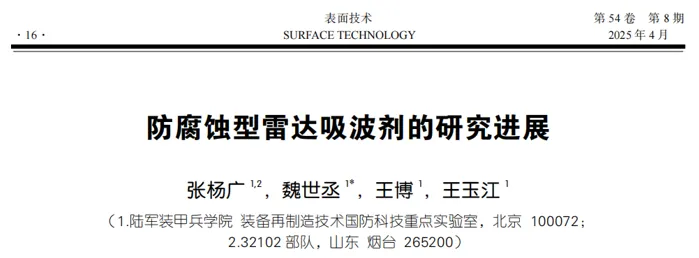 第一作者:张杨广 通信作者:魏世丞 第一作者单位:陆军装甲兵学院 DOI:10.16490/j.cnki.issn.1001-3660.2025.08.002 基金项目:中国博士后科学基金(2024M754249) 近年来,随着战场电磁探测技术的飞速发展,装备隐身与反隐身之间“矛”与“盾”的较量日趋激烈,谋求装备全域隐身化已经成为世界军事强国激烈竞争的技术制高点。雷达吸波涂料因其成本低廉、制备简单、不受目标几何形状限制等优点,一直受到各国的重视[1-2]。作为吸收电磁波的核心成分,高性能吸波剂的开发一直以来都是研究的热点,铁磁性材料(铁氧体、羰基铁、四氧化三铁等)、磁性金属材料(铁、钴、镍及其合金等)、碳基材料(石墨、石墨烯、碳纳米管等)、导电聚合物基材料(聚苯胺、聚吡咯、席夫碱等)、碳化硅陶瓷等多种材料已被开发用作吸波剂,金属有机骨架(MOF)、二维过渡金属碳化物和氮化物(MXenes)、生物质衍生碳(BDC)等新型吸波剂也得到了广泛的研究[3-5]。目前,为了提高吸波材料的耐蚀性,学者们已经开展了一些研究,包括对磁性吸波剂表面改性、构建表面包覆涂层、空心结构嵌入耐蚀剂以及开发新型防腐吸波剂等。本文通过总结相关研究开发思路、制备技术手段和检测评价方法,以期为防腐蚀型雷达吸波剂(以下简称为防腐吸波剂)的研制和工程应用提供指导,进而为提高装备隐身能力提供助力。 王志,董世运,闫世兴,刘晓亭,李立伟,夏丹.增材制造金属零件超快激光抛光技术研究进展[J].表面技术,2025,54(7):19-33.