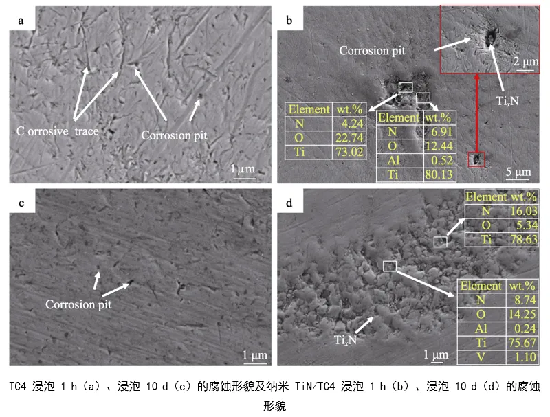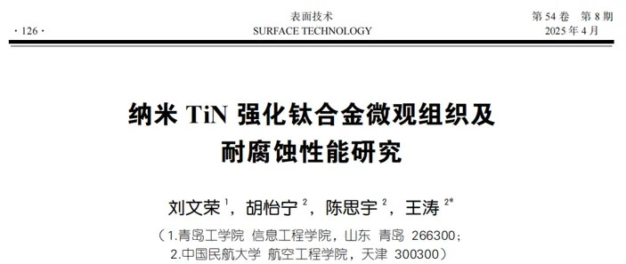 第一作者:刘文荣 通信作者:王涛 第一作者单位:青岛工学院 DOI:10.16490/j.cnki.issn.1001-3660.2025.08.011 基金项目:国家自然科学基金(52172360);中央高校基本科研业务费项目(3122023PY09) 背景与意义: TC4 合金具有比强度高、力学性能优异、生物相容性好的优点,在航空航天、生物医药、海洋工程等领域有着广泛应用[1-2]。然而,随着 TC4 合金服役环境日益极端,由酸碱、高温和交变载荷等恶劣工况导致的点蚀、应力腐蚀开裂和腐蚀疲劳等损伤变得越来越严重[3-4]。为了延长 TC4 合金的服役寿命并确保尖端装备的安全性,提高 TC4 合金的抗腐蚀能力具有重要意义。增材制造(AM)为钛合金的表面改性提供了新的工艺和设计思路[12]。其中,激光定向能量沉积(L-DED)技术沉积效率高,能够进行特定损伤位置和特殊部件的修复以及异种材料制造[13]。使用L-DED 技术构建 TiN 增强钛基复合材料在提升钛合金性能方面展现出巨大潜力。Tai 等[14]原位合成了TiN/TC4 复合材料,成功提升了钛合金的硬度、强度与延展性。Zhang 等[15]研究了 TiN+TiB/TC4 复合涂层的抗摩擦腐蚀性能,发现随着原位 TiN 相的增多,摩擦腐蚀速率大幅降低。Balla 等[16]评估 TiN 增强 TC4复合涂层的摩擦学性能,结果表明添加 40%(质量分数)TiN 后 TiN/TC4 耐磨性最好。虽然学者们对 L-DED 制备的 TiN/TC4 复合材料的微观组织、耐磨和力学性能进行了大量研究,但对其耐腐蚀性能的研究仍然不够充分。因此,本文采用L-DED 技术制备了 TC4 合金和纳米 TiN/TC4 复合材料,研究了 2 种材料的微观结构及在 3.5%(质量分数)NaCl 溶液中的电化学腐蚀行为和形貌,揭示了纳米 TiN 增强的 TC4 合金钝化膜的生长及耐腐蚀性。 刘文荣,胡怡宁,陈思宇,王涛.纳米TiN强化钛合金微观组织及耐腐蚀性能研究[J].表面技术,2025,54(8):126-135.