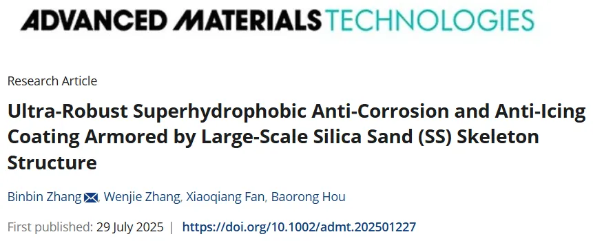 近日,中国科学院海洋研究所张斌斌团队以大尺度石英砂作为骨架结构设计构筑了一种具有高机械稳定性的铠甲化超疏水复合涂层。该涂层由环氧树脂(EP)底层、大尺度石英砂(SS)颗粒中间层和氟化高岭土@玻璃纤维@环氧(F-KL@GF@EP)超疏水面层构成。制备的具有三层结构的超疏水EP/SS/F-KL@GF@EP涂层展现出显著提升的机械稳定性,在经历2750次砂纸磨擦循环、2700克砂粒冲击、270分钟持续水滴冲击以及1600次胶带剥离测试后,仍能维持其超疏水特性。 此外,该涂层还展现出优异的自清洁、斥液性、防腐和防冰等多功能特性。表面电荷转移电阻(Rct)提升了九个数量级,表明其具有优越的耐腐蚀性。即使在3.5 wt.%氯化钠溶液中浸泡35天后,仍能保持其长效防腐性能。此外,所制备的大尺度石英砂铠甲化超疏水涂层能有效减缓热传导,显著延长表面水滴的冻结时间,具有很好的低温防冰应用潜力。 本研究的成果对于设计开发具有高机械稳定性的超疏水功能防护材料具有重要的借鉴意义,相关结果发表在 Advanced Materials Technologies杂志。 该研究得到了山东省重点人才工程-泰山学者青年专家项目(tsqn202408278)和山东省优青项目(ZR2022YQ35)的资助,谨此感谢。 论文信息 Ultra-Robust Superhydrophobic Anti-Corrosion and Anti-Icing Coating Armored by Large-Scale Silica Sand (SS) Skeleton Structure Binbin Zhang*, Wenjie Zhang, Xiaoqiang Fan, Baorong Hou Advanced Materials Technologies DOI:10.1002/admt.202501227 作者介绍 张斌斌,中国科学院海洋研究所特聘研究员,山东省泰山学者青年专家、山东省优青、中国科学院青年创新促进会会员、山东省暨青岛市腐蚀与防护学会理事。主要从事仿生超疏液海洋防腐防污材料、材料海洋环境使役行为与机制、先进功能复合涂层与防护技术等方面的研究工作。先后主持国家级和省部级科研项目10余项,其中获批省部级人才项目3项,目前以第一作者和通讯作者在Chem. Eng. J.、J. Mater. Sci. Technol.、Corros. Sci.、Mater. Des.、Prog. Org. Coat.等重要学术期刊发表SCI论文80余篇,合作出版英文专著1部,获授权国家发明专利9件,论文总被引3600余次,H因子35,入选斯坦福-爱思唯尔全球前2%科学家榜单,并获山东省青年海洋科技奖、青岛市青年科技奖、海洋强国青年科学家提名、中科院朱李月华奖等奖励。 原文链接 https://advanced.onlinelibrary.wiley.com/doi/10.1002/admt.202501227