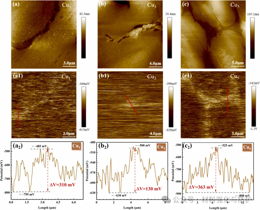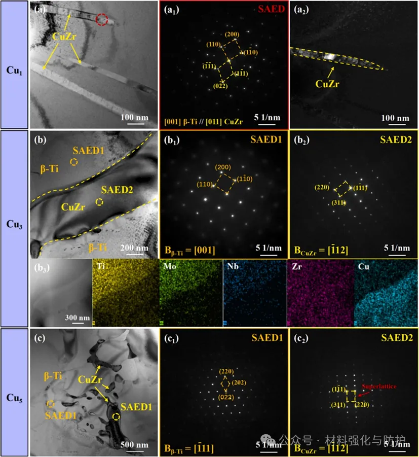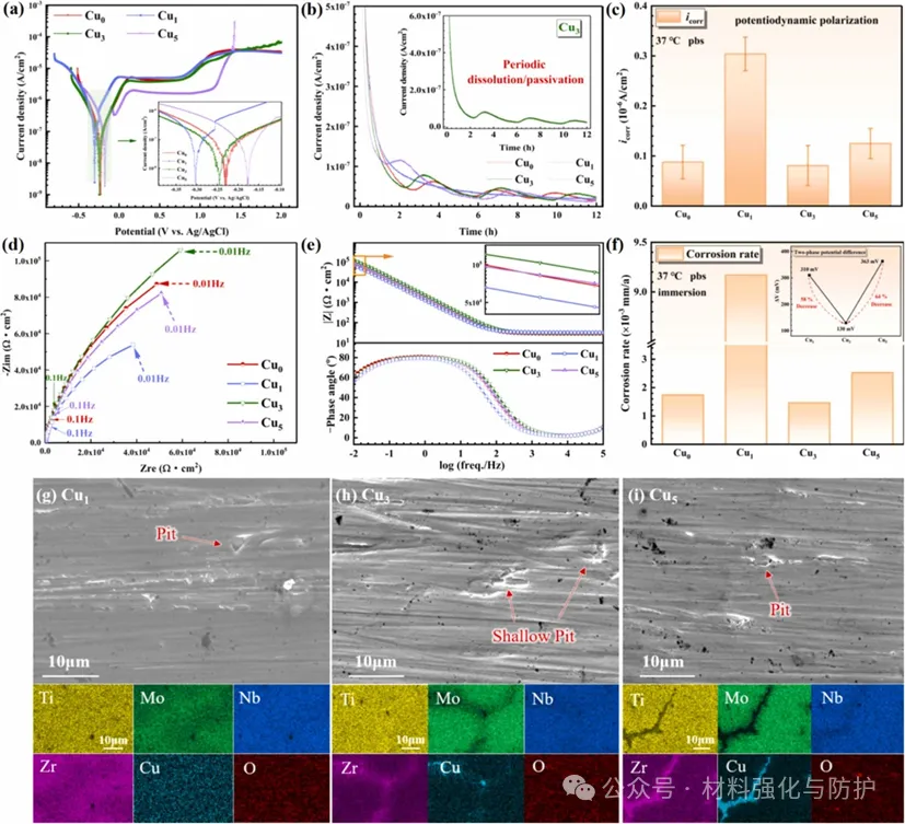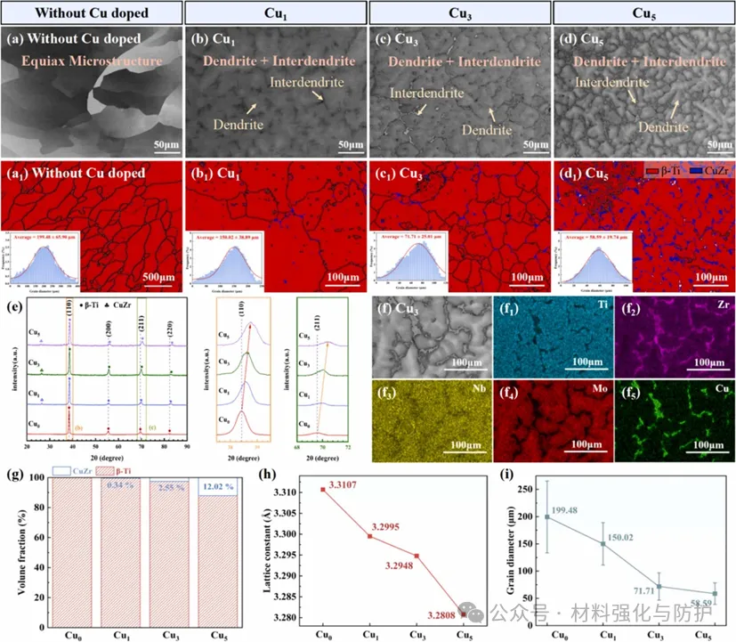 不含Cu元素的合金为单一β-Ti的BCC相,添加Cu后会析出四方相CuZr,且Cu含量越高,CuZr相体积分数越高(0.34%→12.02%)、晶粒尺寸越小(199.48μm→58.59μm);其中Ti₅₁Zr₁₅Nb₁₄Mo₁₇Cu₃合金的CuZr相与β-Ti相间电位差最优(~130mV),显著低于Cu₁(310mV)和Cu₅(363mV),降低了电偶腐蚀风险。