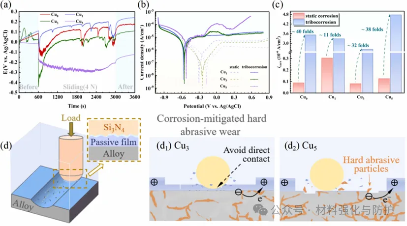 (a) 摩擦腐蚀下的OCP, (b) 摩擦腐蚀和PBS溶液中静态腐蚀下的动电位极化曲线和 (c) Icorr的比较, (d-d2) TiZrNbMoCux合金摩擦腐蚀机理示意图
