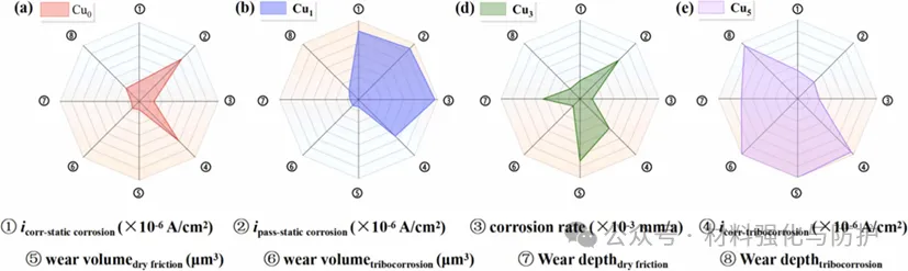 虽然干摩擦下Cu₃合金因CuZr硬相脱落有一定磨损,但在37℃ PBS溶液的摩擦腐蚀环境中磨损体积仅为干摩擦的1.7倍,而其他合金>2倍,且摩擦腐蚀时的腐蚀电流密度最低,为2.620×10⁻⁶ A/cm²,实现了腐蚀与磨损性能的平衡。