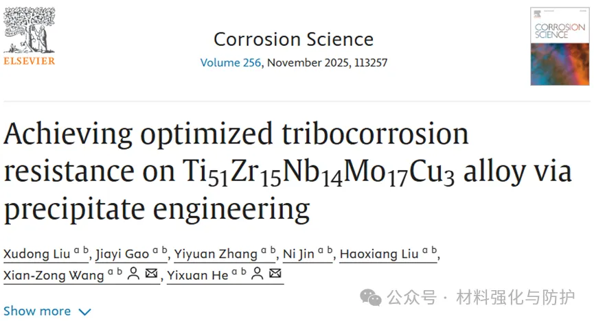 该研究制备了Ti₅₄₋ₓZr₁₅Nb₁₄Mo₁₇Cuₓ合金并探究Cu含量对其耐磨蚀性能的影响,得出Ti₅₁Zr₁₅Nb₁₄Mo₁₇Cu₃合金因适度的CuZr析出相优化电位差与氧化膜稳定性,展现出了最优的耐磨蚀性能。未来可进一步进行生物相容性相关研究,推动该类材料向人工骨科植入物临床应用转化。