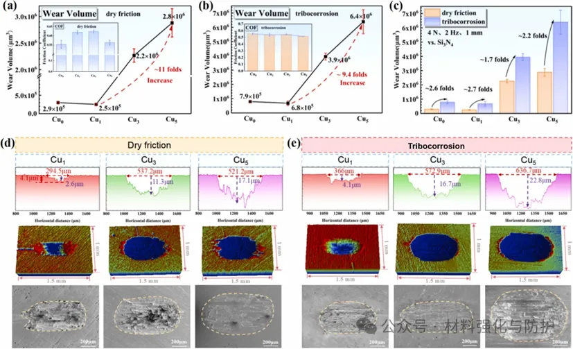 (a) 干摩擦和 (b) 摩擦腐蚀下的磨损量, (c) 磨损量比较,TiZrNbMoCux(x = 1,3,5at.%)合金在干摩擦(d)和摩擦腐蚀试验(e)后的三维形貌和SEM图像