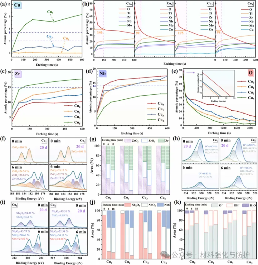 Cu₃合金腐蚀抗性最强,其腐蚀电流密度(0.081μA/cm²)最低,浸泡20天后腐蚀速率~1.465×10⁻³ mm/a,该数值仅为Cu₁(~9.17×10⁻³ mm/a)的16.2%,且该合金表面氧化膜最厚,氧化膜中富含高稳定性的ZrO₂和Nb₂O₅,保护性显著优于其他合金。