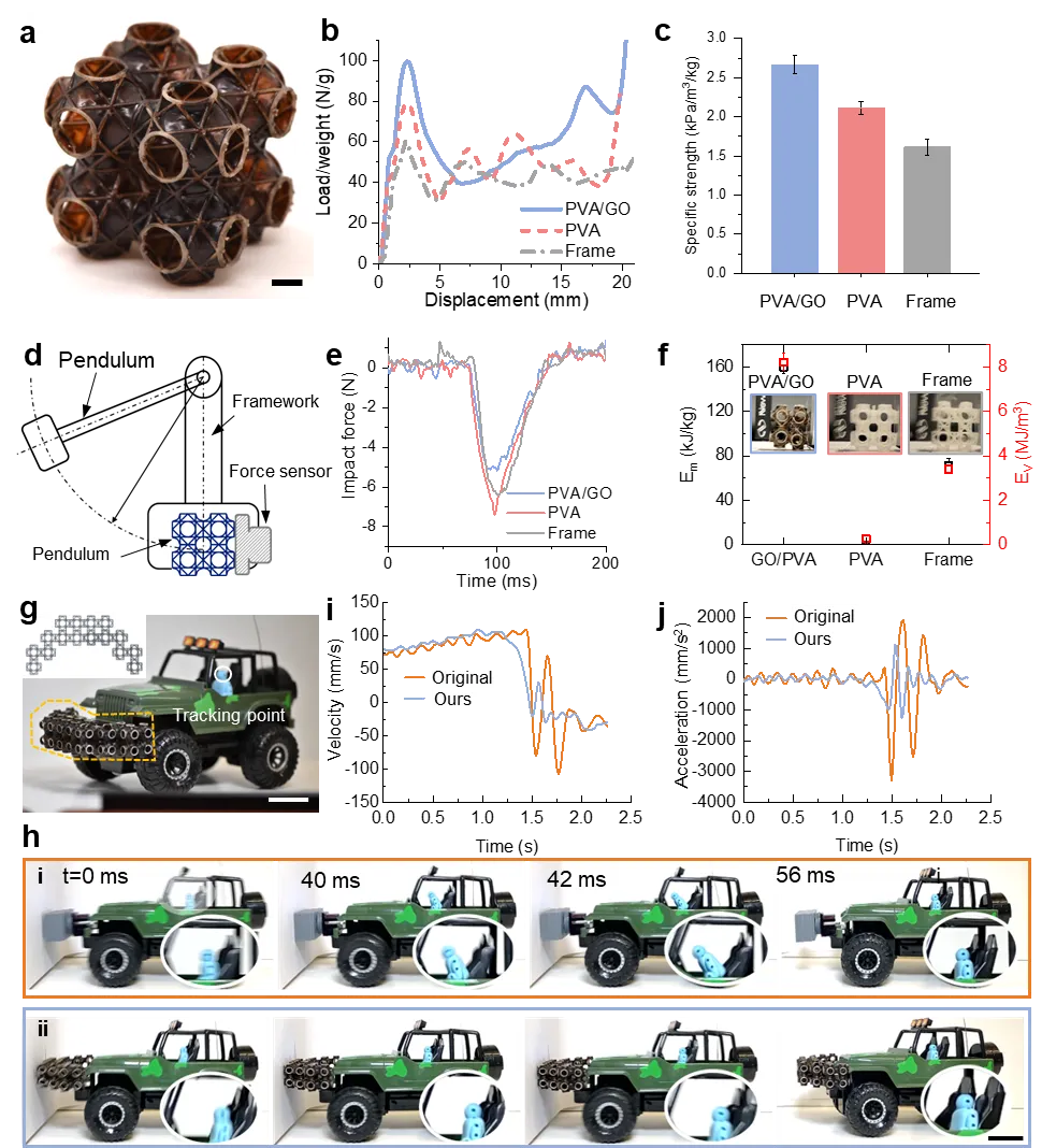 图4 PVA/GO 皂膜涂覆的 2×2 Schwarz-P 结构的吸能表现和作为保险杠的验证