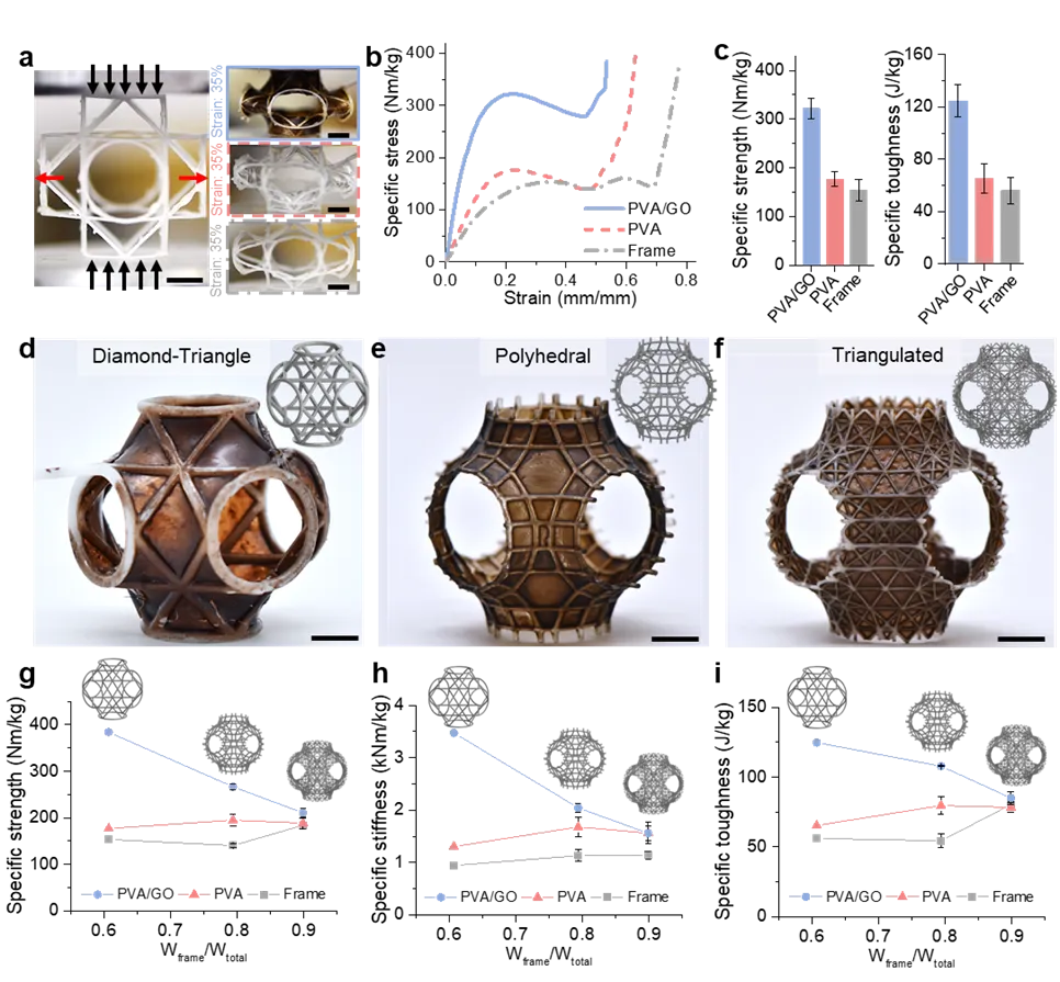 在结构层级,团队基于多面体图静力(PGS)设计不同网格细分(菱形三角 、多面体、三角化),在保持总体积与等效密度一致的前提下开展对比:当网格密度较高、跨膜面积较小(多面体/三角化)时,皂膜难以承担并重分配主载荷,涂覆增益有限;当降低网格密度、增大跨膜面积(菱形三角)时,受力由杆—梁弯曲转为薄膜伸展并伴随受控后屈曲,PVA/GO 涂覆样品的比强度、比刚度与比韧性均显著提升,其中比强度可达 384.30 N·m·kg⁻¹ (图3)。作者同时展示了 2×2 Schwarz-P 阵列在未涂覆、PVA 涂覆与 PVA/GO 涂覆条件下的承载对比,以及超轻 2×2 P 结构涂覆 PVA/GO 皂膜后置于气球上承受保龄球重量的演示。