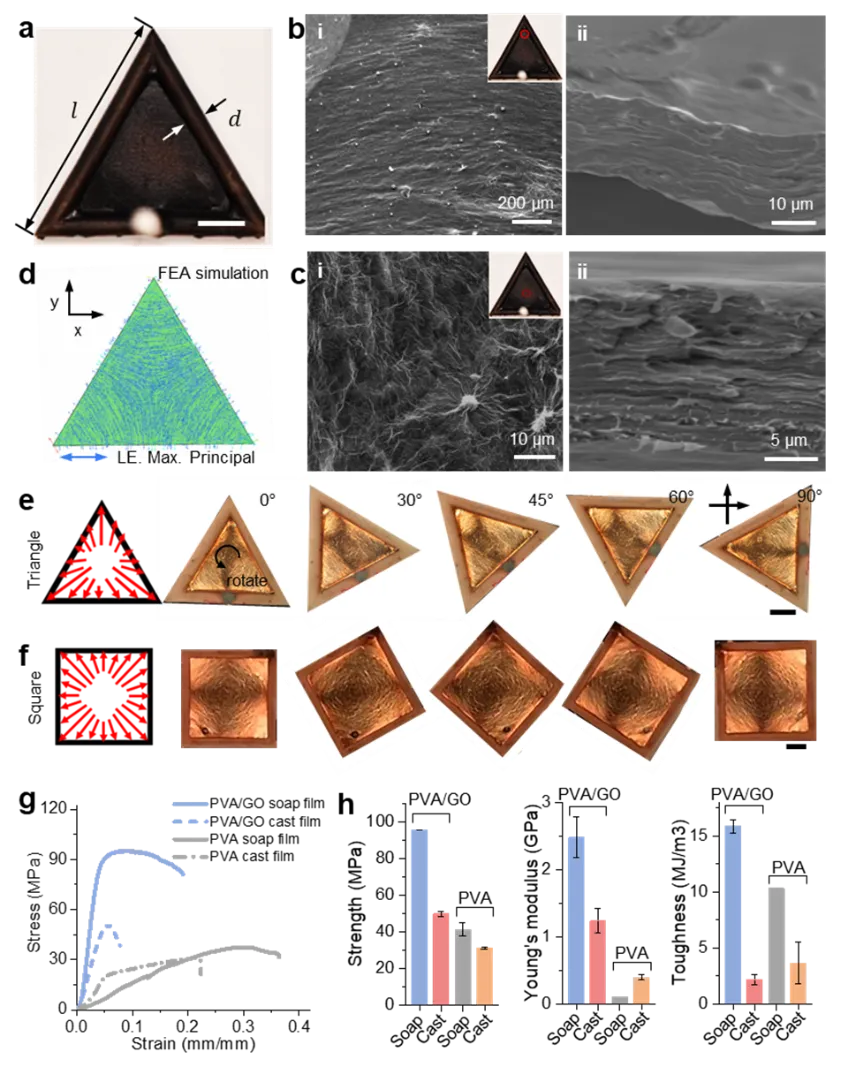 图 2不同几何模板上的 PVA/GO 皂膜及其力学性能
