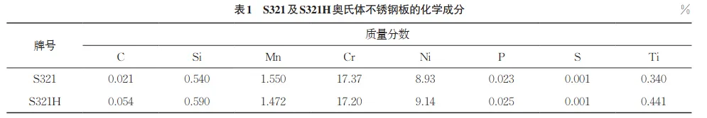 试验选用S321及S321H奥氏体不锈钢板的化学成分如表1所示。