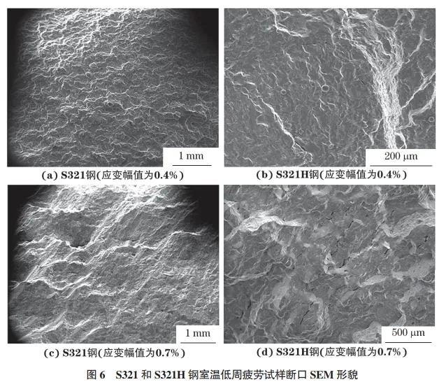 S321和S321H钢室温低周疲劳试样断口SEM形貌如图6所示。由图6可知:当应变幅值较小时,试样断口比较平整;当应变幅值较大时,试样断口辉纹较密,颜色较暗;S321H钢试样断口在较大应变幅值下有一些非扩展的二次裂纹出现,且大应变幅值下,第二相颗粒对裂纹的萌生有促进作用,裂纹沿孔洞扩展。