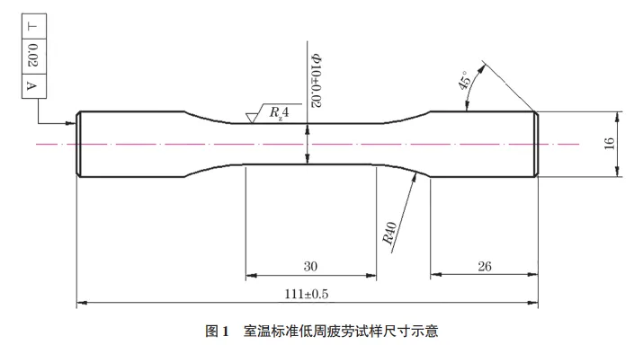 将两种不锈钢材料制成室温及高温标准低周疲劳试样,试样尺寸如图1,2所示。室温试样标距段长度为30mm,标距段直径为10mm,总长度为111mm。高温试样标距段长度为21mm,标距段直径为7mm,夹持部分采用螺纹配合。