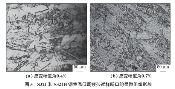 利用光学显微镜观察S321和S321H钢室温低周疲劳试样断口的显微组织形貌,结果如图5所示。由图5可知:应变幅值越大,材料在低周疲劳下产生的形变马氏体越多。