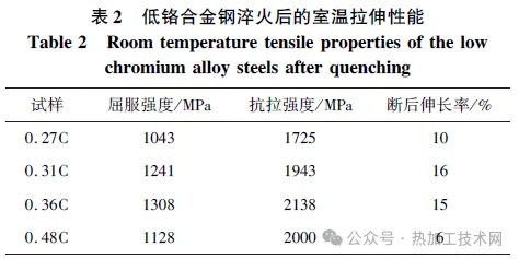 表2为不同碳含量的低铬合金钢淬火后的室温拉伸测试结果。可以看出,碳含量的变化对低铬合金钢的强度和塑性均有一定的影响。随碳含量的逐渐升高,低铬合金钢的屈服强度和抗拉强度均呈先上升后下降的变化趋势。含碳量为0.36%时的强度达到最大值,抗拉强度为2138MPa,屈服强度为1038MPa,相比于含碳量为0.27%时分别增加了23.9%和25.4%,增幅接近。但是当碳含量增加到0.48%时,抗拉强度和屈服强度分别下降到2000MPa和1128MPa。随着碳含量的升高,伸长率也呈现出先上升后下降的变化规律,碳含量为0.31%和0.36%时的伸长率较高,达到15%以上,但是当碳含量继续增大到0.48%时,伸长率下降明显,仅有6%,降幅达到60%。