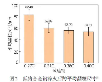 不同碳含量的低铬合金钢淬火后的光学显微组织如图1所示。从图1可以看出,合金钢淬火后的组织主要为马氏体,原奥氏体晶界清晰,晶粒分明。进一步分析发现,随着合金钢中碳含量的逐步提升,平均晶粒尺寸有明显减小。图2为晶粒尺寸的定量测试结果,当碳含量为0.27%时,平均晶粒尺寸为82.46μm,而当碳含量增加到0.48%时,平均晶粒尺寸减小到53.61μm,晶粒得到细化,但细化效果在碳含量达到0.36%以上时不明显。此外,从图1还可以看出,当碳含量为0.27%时,马氏体主要呈现出平行束状的组织特征,且以板条马氏体为主。然而,当碳含量升至0.31% 时,以平行束状为主的马氏体开始增多并呈交错排列的形态,表明马氏体主要以片状马氏体存在。