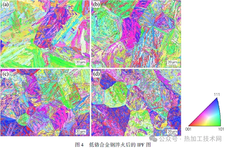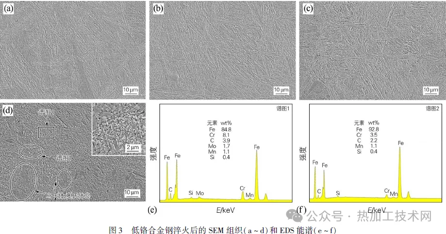 利用线切割技术,从淬火态试样上切割出尺寸为10mm×10mm×10mm的金相试样,尺寸为10mm×10mm×55mm的无缺口室温冲击试样,以及标距段为10mm的板状拉伸试样。金相试样经180~1500目砂纸逐级打磨和抛光后,采用苦味酸⁃盐酸⁃酒精溶液(1g苦味酸+100mL酒精+5mL盐酸)浸蚀10s,然后用Leica DMI3000M金相显微镜(OM)进行显微组织观察,并使用Nano m=Measurer软件计算晶粒尺寸,用Gemini SEM300 扫描电镜(SEM)观察其组织并进行能谱分析(EDS)和电子背散射衍射(EBSD)测试,测试加速电压为25kV扫描步长为0.18μm,EBSD试样经打磨和抛光后再用高氯酸⁃冰醋酸(体积比1:9)电解液电解抛光210s,之后迅速置于酒精中超声波清洗5~10min。采用HR-150型洛氏硬度计对低铬合金钢进行硬度测试,取5处不同位置测量结果的平均值。在室温条件下采用JB-500摆锤式冲击试验机进行冲击试验,采用LF 5105型动态万能试验机进行拉伸试验,拉伸速率为1mm/min,每种试样均进行两次重复测试,取平均值为最终结果。
