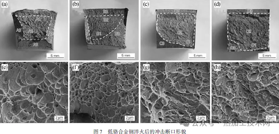 图7不同碳含量的低铬合金钢淬火后的冲击断口形貌。由图7(a ~d)可以看出,宏观断口可分为3个不同的区域:纤维区(A1、B1、C1和D1),放射区(A2、B2、C2 和D2)和剪切唇区(A3、B3、C3和D3),这些区域的相对面积是评估韧性的重要指标。对比宏观断口形貌可知,随着碳含量的增大,剪切唇区的相对面积减小,放射区的相对面积增大,断裂表面的塑性变形特征减弱,材料的冲击性能降低,脆性增加。碳含量为0.27%~0.36%时合金钢在断裂时有明显的塑性变形,为韧性断裂特征,断口凹凸不平,表明在断裂过程中,裂纹扩展路径更为曲折,韧性较高。而碳含量为0.48%时的断口平齐,塑性变形不明显,呈现出韧-脆混合断裂特征,韧性相对较低。图7(e~h)为放射区内的微观断口形貌,可以看出,断口微观形貌均以韧窝为主。对比可知,碳含量为0.27%时断口上存在较多的韧窝,韧窝尺寸明显较碳含量为0.31%和0.36%的更大,表明其塑性变形更大,韧性断裂特征显著,冲击吸收能量更高。碳含量为0.48%时,韧窝数量明显减少,出现解理断裂特征。不过,微区内也可见一定数量的尺寸稍大的韧窝,这可能是因为组织中存在残留奥氏体,在冲击过程中以韧性方式断裂,且由于残留奥氏体一般分布于马氏体或原奥氏体晶粒的界面处,能够有效阻止马氏体解理断裂裂纹的快速发展。