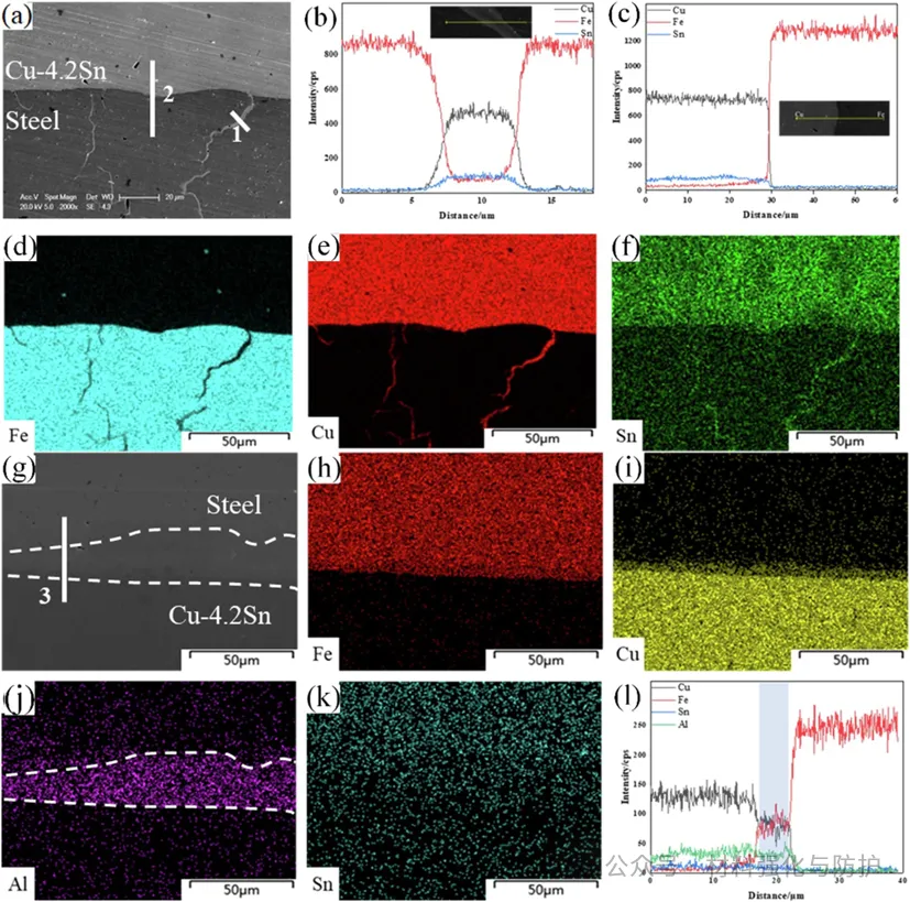 锡青铜直接沉积在钢基上会形成穿透裂纹,而在钢基表面预镀 2μm Al层后,形成约6–7μm的过渡层,裂纹完全消失。第一性原理计算进一步表明,Sn在Fe晶界中的偏析会显著削弱结合强度,而Al的影响较小,因此Al涂层能够有效抑制裂纹萌生与扩展。
