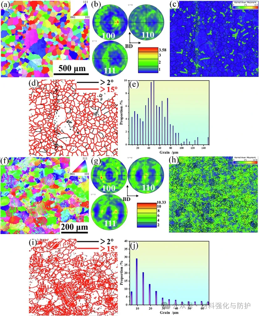 沉积工艺与轧制工艺的晶体学特征表征与对比:(a-e)沉积合金;(f-j)轧制合金