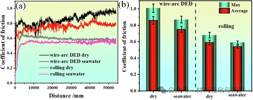 摩擦测试表明,轧制态合金摩擦系数下降约30%,质量损失降低约25%,磨损机制由粘着磨损转变为沟槽磨损,裂纹扩展受抑制。电化学与磨损联合分析显示,腐蚀-摩擦耦合导致的额外损伤占总损伤约13%,摩擦促进腐蚀是主导机制(约11%)。轧制态样品在摩擦环境下表现出更优异的耐蚀-耐磨综合性能。