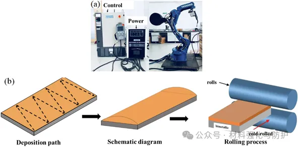 该研究预先在低碳钢的表面预镀了2μm的Al作为锡青铜与钢材之间的结合区域,随后以氩气作为保护气体通过DED制备Cu-4.2Sn锡青铜层,并通过多尺度的表征手段系统对比了沉积态与轧制态合金在显微组织、力学性能、摩擦磨损与腐蚀-摩擦协同作用方面的差异,实验过程中所采用的腐蚀介质为模拟海水。