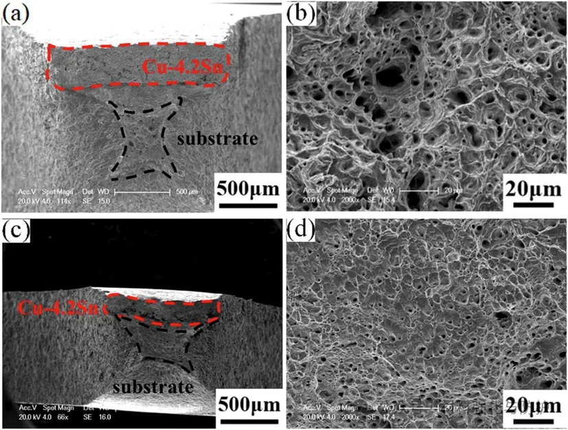 合金的断口形貌:(a,b)沉积合金;(c,d)轧制合金