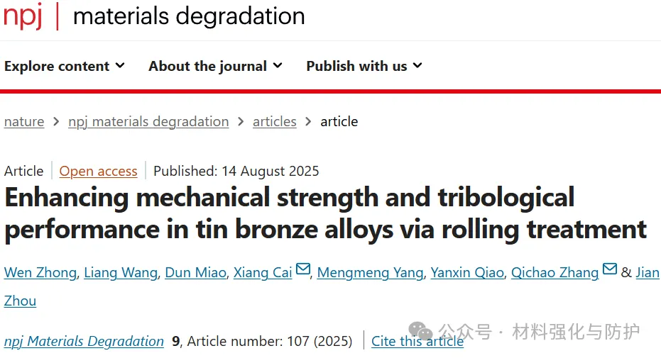 研究提出的“Al涂层+冷轧调控”策略,有效解决了锡青铜/钢复合材料中的界面裂纹问题,并通过晶粒细化与孪晶构建,实现了强度、硬度和耐磨性能的同步提升。这一成果为舰船推进轴承、潜艇关键部件及海洋开采装备在复杂腐蚀-摩擦环境中的长期服役提供了新思路,也为铜基合金在高端装备中的应用拓展奠定了坚实基础。