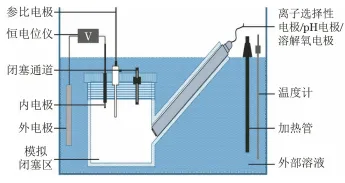 搭建如图1所示的闭塞电池模型试验装置,用于模拟金属局部腐蚀发展阶段的研究。其中模拟闭塞区体积为110mL,将其浸在10L的外部溶液池内,其材料均为有机玻璃。在模拟闭塞区顶部开孔插入内电极(模拟金属局部腐蚀过程中闭塞电池阳极区的工作电极,为430不锈钢试样) 、参比电极(饱和甘汞电极SCE) 并留有闭塞通道,闭塞通道用模拟锈层进行填充,模拟锈层由快速滤纸负载混氧化铁[65%(质量分数,下同) Fe2O3+25%Fe3O4 +10%Fe(OH)3]制作而成。模拟闭塞区侧面设有与底部成45°角的斜插管,根据试验需要装入在线pH电极、离子选择性电极和溶解氧电极,实时监测模拟闭塞区内各参数的变化。工作电极(内电极)和对电极(外电极)均为430不锈钢,分别模拟腐蚀阳极和阴极。试验前后均按照化学清洗法对电极试样进行处理。