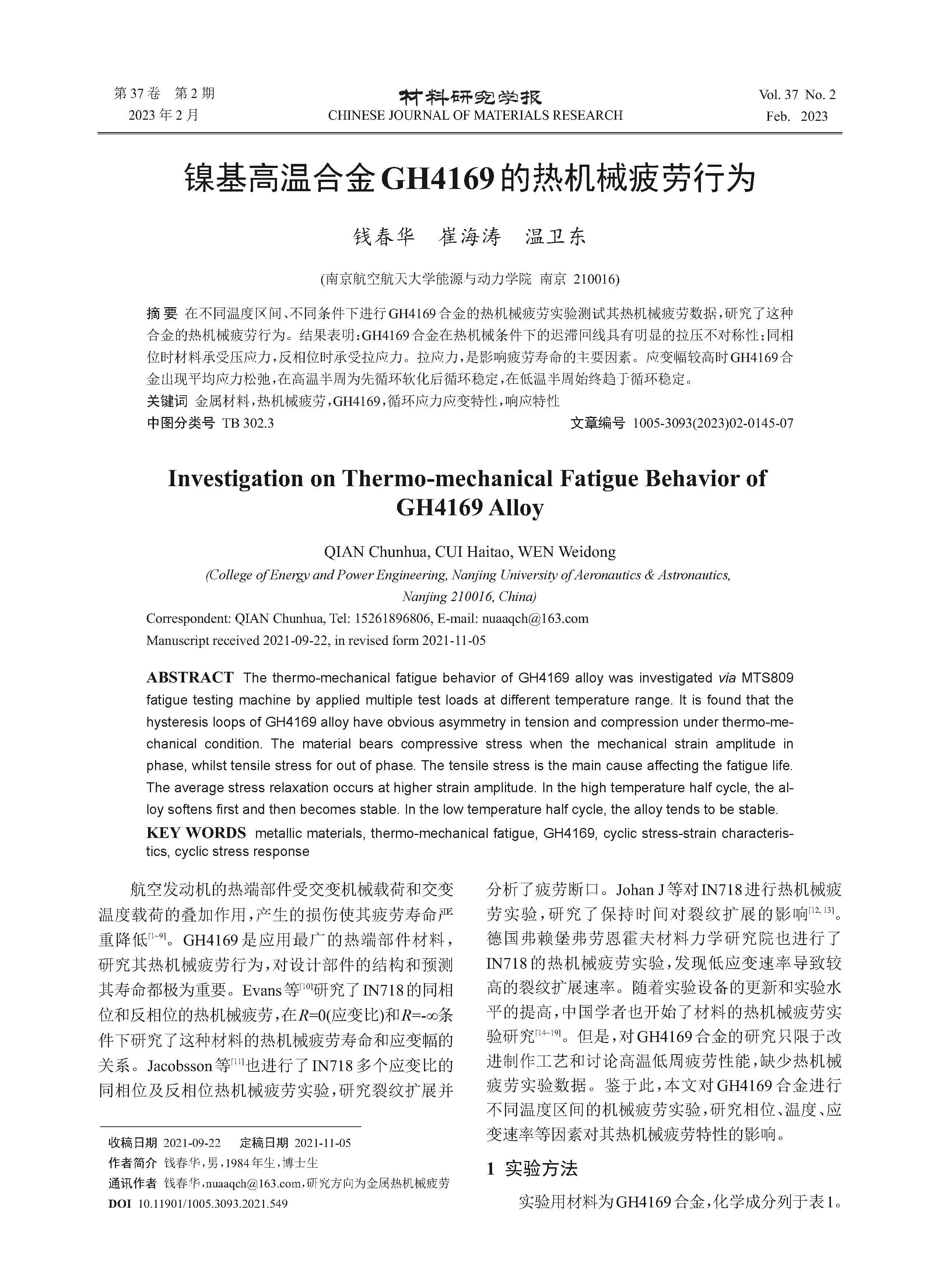 镍基高温合金GH4169的热机械疲劳行为