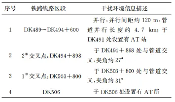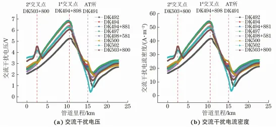 随着国民经济的快速发展,能源和轨道交通运输的发展也步入了快速发展阶段。截至2022年底, 我国长输油气管网总里程约18万km,全国铁路营业里程达15. 5万km,其中高速铁路里程达4. 2万km。至2025年,全国省区市成品油、天然气主干管网全部连通;远期展望到2030年,铁路网里程将达到20万km左右,其中高速铁路里程达4.5万km左右。受地理条件和成本限制,电气化铁路和油气管道往往铺设在同一条公共交通走廊上,这种现象在能源和轨道交通需求旺盛的地区更为凸显,两者分布趋于密集,导致一定范围内管道出现交叉穿越或近距离伴行的问题,埋地管道受到电气化铁路交流杂散电流干扰,管道交流腐蚀风险增大,国内外已相继报道了多起交流干扰案例。受并行电气化铁路交流干扰影响,加拿大一条天然气管道发生了交流干扰腐蚀穿孔、泄漏事故;德国某聚乙烯涂层管道出现两处异常交流干扰腐蚀。在我国,早在1984年就有报道:成品油管道受并行的宝成铁路交流干扰影响,管道交流干扰电压达37V;秦沈客运专线、京沪高铁、运煤铁路干线电气化铁路对周边临近管道产生的交流干扰电压分别达167,46. 7,60V。交流电气化铁路对管道交流干扰问题日益突出,得到了从业者的密切关注。为降低管道交流干扰风险,相关标准均指出,管道周边出现新的交流干扰源时,应开展交流干扰安全评估。 为评估电气化铁路对管道交流干扰影响的风险,现国内外主要采用公式解析法或数值模拟的方法。公式解析法将干扰系统中管道和干扰源等效为不同电器元件,并构建等效干扰电路,基于电场理论推导出干扰模型简化计算公式进行求解。目前公式解析法多以单一干扰机制(或阻性耦合或感性耦合)建立模型,存在适用性局限问题;过度简化干扰模型的计算参数,导致计算结果精度低,模型无法处理复杂情况等问题。而有限差分法、有限元法和边界元法等数值模拟方法可通过求解麦克斯韦方程组(感性、容性耦合) 和拉普拉斯方程组 (阻性耦合),利用迭代计算获得复杂工况下干扰区域的电、磁场分布。目前,数值模拟技术为复杂情况下管道交、直流干扰评估与缓解设计提供了有效解决途径并得到了广泛应用。 某新建快速铁路与已建天然气管道在空间上存在多处交叉和近间距并行,为确保新建铁路工程顺利建设,同时掌握管道受新建电气化铁路交流干扰的风险,保障管道运行安全,笔者对该天然管道开展了现场干扰检测,基于检测结果,利用专业电磁干扰数值模拟软件SESCDEGS评估了新建铁路对管道交流干扰的影响规律,并设计了干扰缓解措施,相关工作可为同行提供一定的借鉴和参考。 1 背景简介 我国电气化铁路采用单相工频交流供电制式,接触网额定电压为25kV,牵引供电示意如图1所示。铁路牵引变电站接外高压输电线路供电、降压,列车受电弓经接触网引流供给列车,电流再经钢轨、大地和回流线返回牵引变电站。钢轨与大地无法实现完全绝缘,机车运行时部分牵引电流经钢轨泄入大地,对管道形成阻性耦合干扰;钢轨回流电流小于接触网牵引供给电流且两者电流方向相反,两电流对管道形成感性耦合干扰。铁路牵引系统对临近埋地钢质管道交流干扰表现为钢轨入地杂散电流的阻性耦合和牵引/回流不平衡电流的感性耦合,电气化铁路对管道交流干扰机理示意见图1。 图1 电气化铁路牵引供电系统及其对管道交流干扰示意 铁路牵引供电形式不同,其对管道干扰原理一致,但干扰规律存在差异。本文中新建铁路正线采用自耦变压器(AT) 供电方式供电,AT供电方式的原理如图2所示。采用AT供电方式时,牵引线路每隔一定间距(约10km) 设置一台绕组比为1∶1的自耦变压器并安装于AT所内,自耦变压器并联于接触网与正馈线之间且中性点与钢轨相接。列车运行时,牵引电流经牵引变电站流出与距列车最近的AT所的正馈线形成一次高压侧回路,经AT所自耦变压器降压后二次低压侧回路电流为I且经钢轨回流,高压侧回路电流为I/2。AT供电方式下,高压侧回路中接触线与正馈线间电流大小相等、方向相反且两者间距小,高压侧回路铁路牵引供电系统对临近管道不平衡电流约为0,区段范围内管道受交流干扰小;二次低压侧回路中管道受钢轨泄漏杂散电流阻性耦合和接触网供给电流/钢轨回流间不平衡电流感性耦合综合影响,区段范围内管道存在交流干扰风险。AT供电方式下,管道受电气化铁路牵引系统干扰主要源于二次低压侧范围内回路,干扰大小受列车位置、AT所间距、管道与铁路相对间距和并行长度等因素影响。 图2 AT供电方式的工作原理示意 新建铁路线路全长84.943km,铁路正线牵引网采用AT供电方式。铁路线路于DK479+250处设置牵引变电所1座,于DK491设置AT所1座、于DK506+230处设置分区所1座。间距小于1 km公共走廊内新建铁路线路与已建管道空间相对关系详情见表1,相对位置如图3所示。 表1 管道与干扰源相对位置 图3 管道与电气化铁路线路相对位置示意 2 模拟参数与现场测试 2. 1 数值模拟参数 为建立准确的电气化铁路对邻近埋地管道交流干扰计算模型,对相关信息进行了收集整理。 (1) 土壤结构 采用Wenner四极法对公共走廊区域内管道沿线土壤电阻率进行了测试,土壤深度为2.5m。测 试结果如图4所示,公共走廊区域土壤电阻率平均值为28.5Ω·m。SESCDEGS软件无法对管道沿线 设置不同土壤结构,为综合评估涉及公共区域管道 受