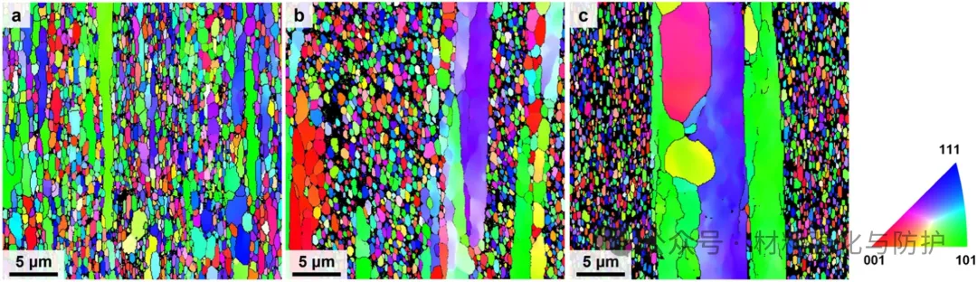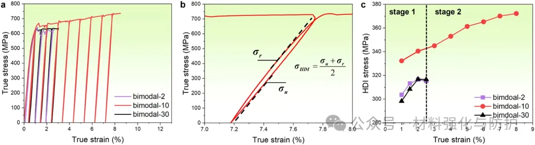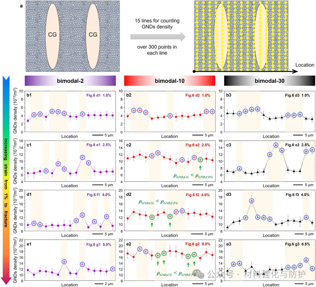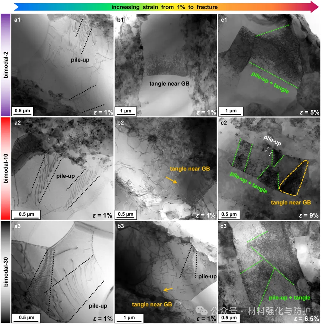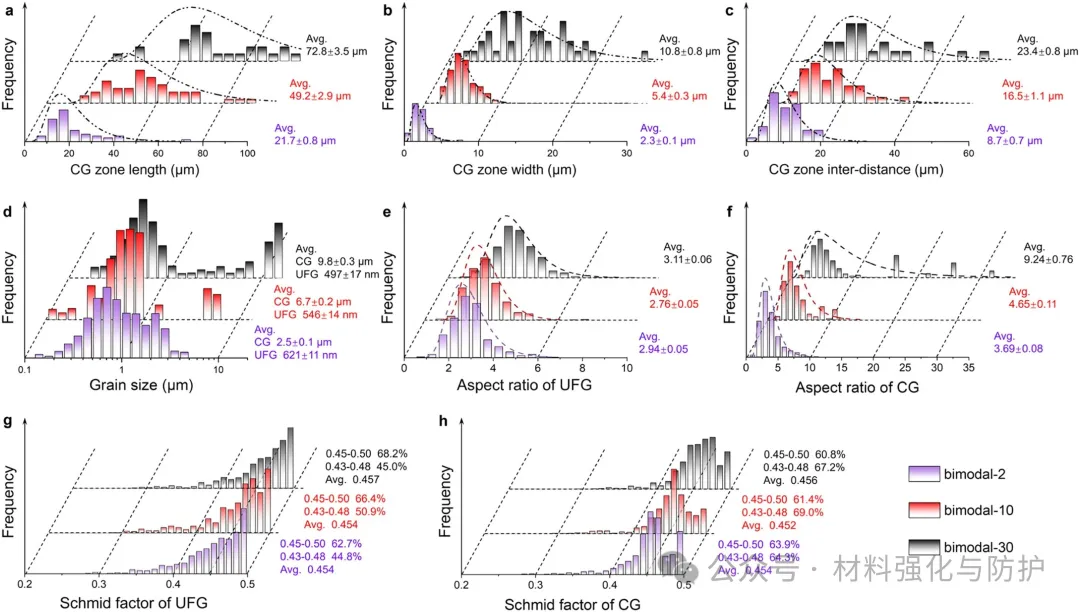 三种双峰晶粒复合材料均具有类似的UFG特征,但粗晶区尺寸不同。统计显示,bimodal-10的粗晶区长度49.2μm、宽度5.4μm、间距16.5μm均为中等值。这种结构使其屈服强度和均匀延伸率显著优于bimodal-2和bimodal-30,显示了“顺序异质效应”对加工硬化的促进作用。