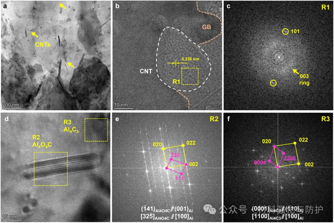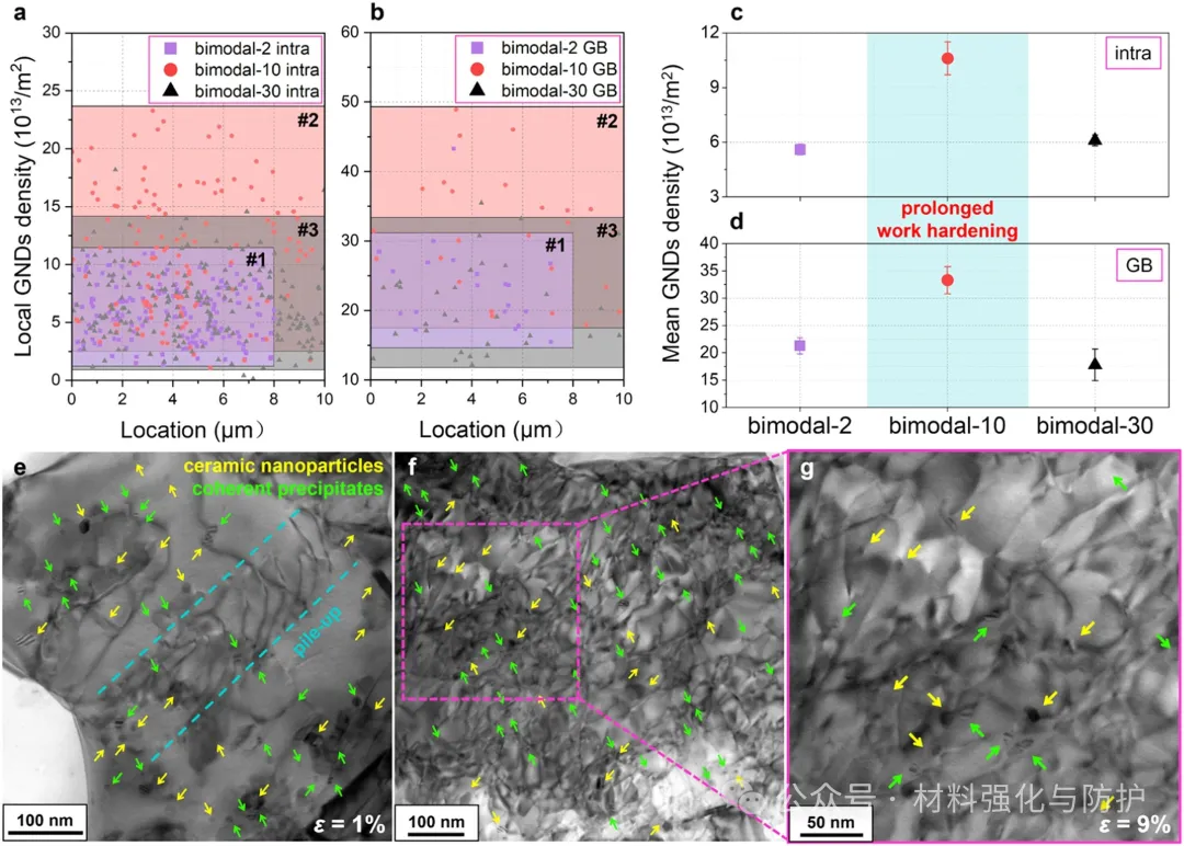 内含CNTs及Al4O4C/Al4C3界面结构的UFG区在小应变(1%-2.5%)时就出现远高于其他两种材料的几何必要位错(GNDs)密度(提高约60%),促进位错增殖和交滑,显著提升了UFG的加工硬化率。硬区不再只是“提供强度”,而是通过位错—纳米颗粒协同作用反向促进了延展性。