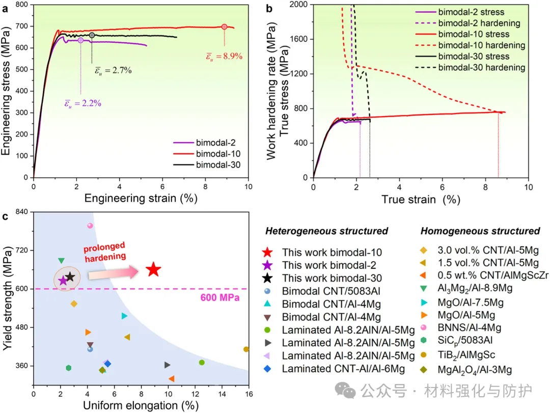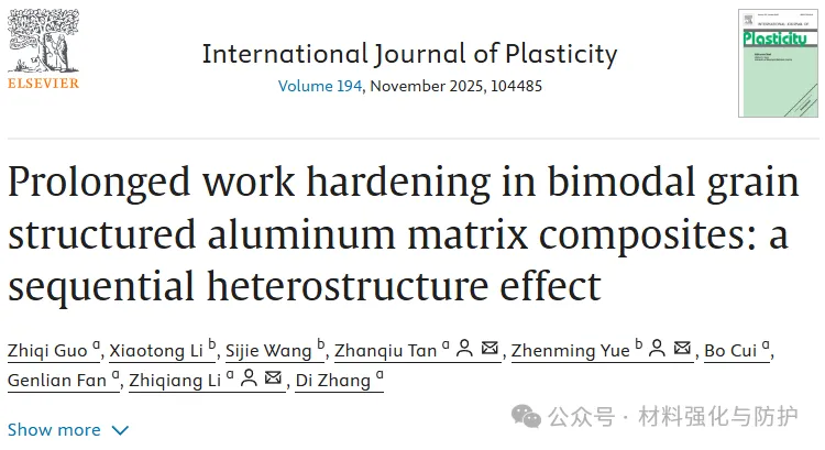 针对这一问题,上海交通大学与山东大学的联合研究团队合作揭示了双峰晶粒异质结构铝基复合材料的“顺序异质效应”,在高强度Al-5Mg/CNTs复合材料将均匀延伸率提升了三到四倍,大大增强了材料的强塑性能适配性。目前,这一重磅研究成果已于2025年9月19日在国际权威期刊《International Journal of Plasticity》在线发表,题为“Prolonged work hardening in bimodal grain structured aluminum matrix composites: a sequential heterostructure effect”,论文的通讯作者为上海交通大学的谭占秋副研究员、李志强研究员和山东大学岳振明教授,上海交通大学金属复合材料全国重点实验室主任张荻院士也位列作者名单中。
