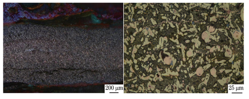 张予南等对比研究了17面汉代铜镜(出土于安吉上马山和临淄) 的腐蚀现象,发现不同埋藏环境中铜镜的腐蚀特征差异较大。上马山铜镜表面类似黑漆古,铜镜本体中α相优先腐蚀;临淄铜镜腐蚀严重,表面腐蚀产物为Cu2O和二价铜的碱式矿化物,铜镜本体中(α+δ) 相优先腐蚀。SARAIVA等对考古出土高锡青铜编钟的微观腐蚀结构进行了研究,发现埋藏或保存环境差异会导致不同的腐蚀模式。邹非池等对四川地区出土青铜器的选择性腐蚀现象及特征进行了分析,并发现了Cu2O与锡腐蚀产物、Cu2O与Cu2(OH)2CO3相互交替的“周期锈蚀现象”。张凯等运用电极电位差的理论对某高铅锡青铜工具中相的选择性腐蚀进行了探讨,指出电极电位较低的相会优先腐蚀。近年来,关于青铜器中自由铜沉积的现象屡有报道,对于自由铜的形成机理存在多种推测, 主要包括电化学腐蚀机理、反合金作用及α相的扩散相变理论等。基于铜镜本体与腐蚀特征研究的科学修复,是文物保护的有效保障。郑利平研究了重庆地区出土的明代铜镜,发现其表面酥粉锈主要为块铜矾,是重庆地区酸性大气环境中SO2侵蚀的产物。赵紫轩等将张家界市博物馆馆藏“漆古”铜镜按照残损情况划分为四类,系统阐述了四类铜镜的保护修复技术。马立治分析了我国古代铜镜的材质和形制特点,通过力学分析揭示其损坏机理,进而提出修复工艺的优化方案及关键实施步骤。 铜镜的腐蚀特征主要受铜镜本体制作工艺和出土环境影响,笔者采用X射线探伤仪、扫描电镜及能谱仪、金相显微镜及拉曼光谱仪等手段分析了保存于陕西历史博物馆的唐代瑞兽纹铜镜的本体及腐蚀产物,并在此基础上提出了科学可行的保护修复对策。 1. 1 试 样 该唐代瑞兽纹铜镜出土于陕西省西安市西郭(国五)M492墓地,现保存于陕西历史博物馆文物库房(详见图1)。该件瑞兽纹铜镜为圆形、直径10.6cm。厚 0.2 cm,镜缘宽2cm、厚1.0cm。铜镜破碎为五块,中间缺失一块,长期受埋藏和保存微环境影响,表面形成了多层腐蚀产物,可见绿色、浅绿色等锈蚀产物及泥土沉积物。采用原位无损分析结合局部碎片样品包埋后分析,研究铜镜基体及锈蚀特征。整个分析过程遵循“最小干预原则”,取样以不影响铜镜原貌及后期修复为前提。 图1 唐瑞兽纹铜镜宏观形貌 1.2 试验仪器及测试条件 采用超景深显微镜(KEYENCE VHX-600E)对铜镜表面形貌进行原位观察。 采用便携式X射线探伤仪Flatscan 27对铜镜内部缺陷进行检测,检测条件为管电压160kV,工作电流0.5mA。 在铜镜断裂处且不影响后续修复的部位取碎片样品包埋,依次采用500、1000、2000号砂纸打磨试样,然后用细绒布抛光,最后用3% (质量分数) FeCl3酒精溶液侵蚀,采用金相显微镜(奥林巴斯BX53M) 观察其微观组织和腐蚀情况。 采用美国PHENOM XL扫描电镜及能谱仪测试铜镜表面腐蚀产物成分,检测条件为加速电压15kV,工作距离5mm,高真空条件,探头模式为背散射。 采用法国Jobin Yvon(LabRAM HR Evolution)拉曼光谱仪对铜镜表面锈蚀物进行表征。检测条件为固体激光器(最大功率50mW),能量设定为最大功率的3.2%~5%,光栅600刻线,光斑尺寸1μm,物镜50×长焦,采集时间3~5s,累积次数2~5次,光谱采集范围100~4000cm-1。 2. 1 超景深显微观察 由图2可见,镜背表面多处存在细小裂隙,表面绿色、浅绿色及红色锈蚀产物层层叠加,锈蚀区域结构疏松。镜面绿色锈蚀产物较浅绿色锈蚀产物结构致密。 图2 铜镜的超景深显微照片 2.2 X 射线探伤检测 由图3可见,该铜镜呈现典型铸造工艺特征,镜钮周边等距分布四组瑞兽纹单元,四只瑞兽围绕镜钮一圈;镜缘明显厚于铜镜中央纹饰区域;腐蚀区域可见明显金属流失现象,局部腐蚀后残留金属基体较薄,多处存在细小裂隙。 图3 铜镜的X射线探伤照片 2.3 显微组织 由图4可见,铜镜长期受埋藏及保存环境影响,形成了多层结构,自表及里依次为:表面腐蚀层、氧化层、自由铜沉积层、腐蚀过渡层及铜镜基体。其中,表面腐蚀层主要由绿色锈蚀产物与泥土沉积物构成;氧化层呈棕红至深褐色,整体结构较为致密;其内侧可见红色薄层,判定为自由铜沉积物。腐蚀过渡层与基体呈渐变过渡,显微组织显示(α+δ) 共析体相发生选择性腐蚀,电解液渗入导致共析体氧化发黑,α相则保存相对完整。腐蚀过渡层中局部铅颗粒腐蚀后形成的孔隙中充填有红色物质,成分与自由铜沉积层相似。基体为典型铸造组织,可见(α+δ)共析体中分布条带状或岛屿状的α固溶体相,铅颗粒呈游离态分布于晶内及晶界,并伴有气孔、微裂纹及夹杂物等铸造缺陷。 图4 铜镜的显微组织 2.4 扫描电镜-能谱分析 由图5、图6及表1可见:试样表面腐蚀层主要元素为Cu、O、Pb、Cl、Al、Si、Na、Fe,主要由黏土沉积物、二价态铜腐蚀产物及铅腐蚀产物构成,局部区域存在含氯腐蚀产物。氧化层主要成分为铜与锡的氧化物,其下方红色薄层为自由铜沉积层。腐蚀过渡层中可见铅腐蚀后形成的孔洞,内部充填自由铜或氧化亚铜(Cu2O);该区域锡质量分数显著升高至41.8%(基体锡质量分数27.3%)。 图5 铜镜的面扫描主要元素分布 图6 铜镜 基体 面扫描全貌及主要元素分布 表1 铜镜的成分分析结果 SEM-EDS 铜镜基体为高锡青铜,含Cu62.9%(质量分数,下同) 、Sn27.3%、Pb9.7%,α固溶体相中含Cu量较高,(α+δ)共析体相中含Sn、O量较高;铅颗粒以游离态分布且多数未腐蚀,尺寸差异显著;其中夹杂物较多,经检测主要为硫及