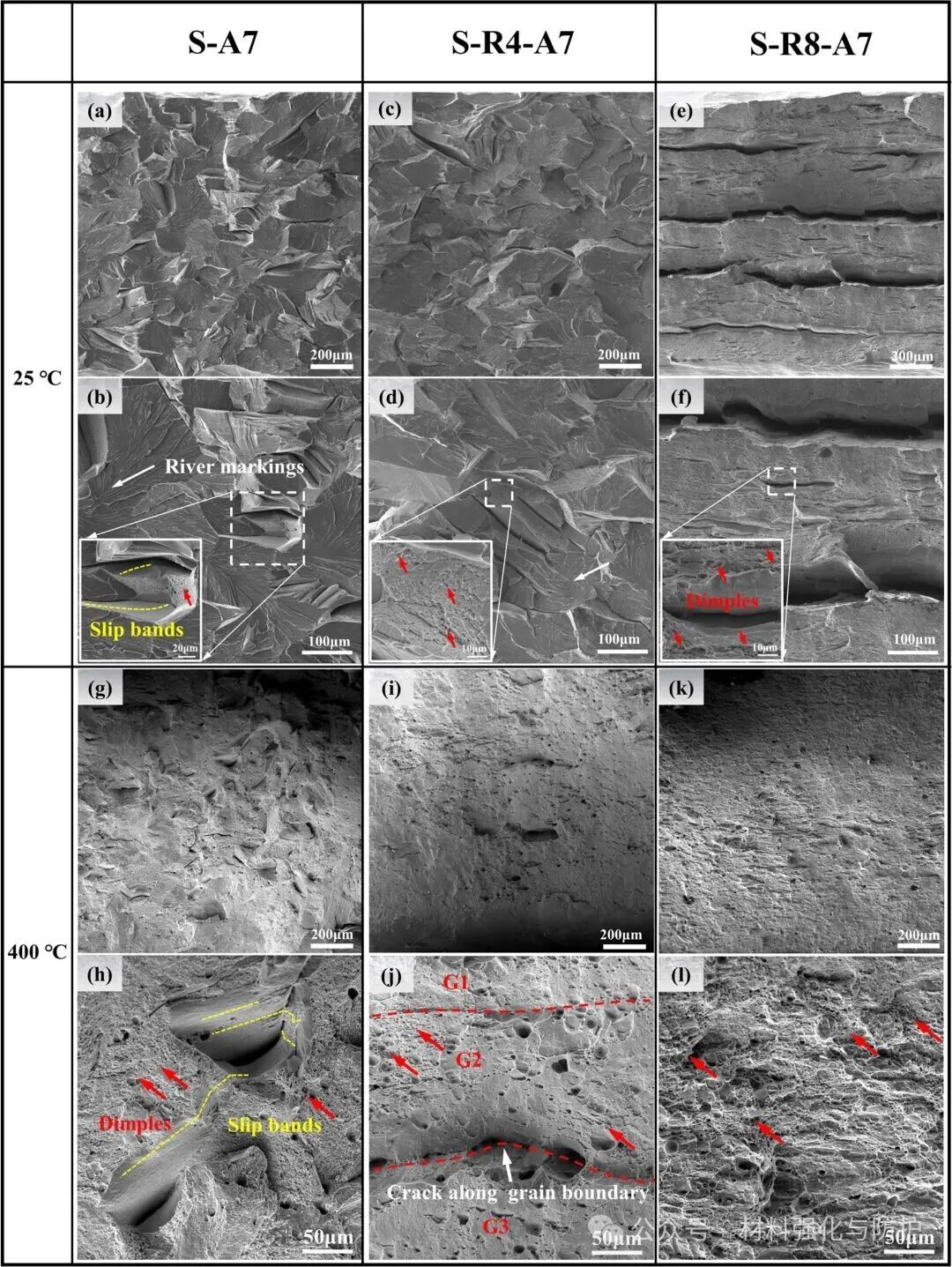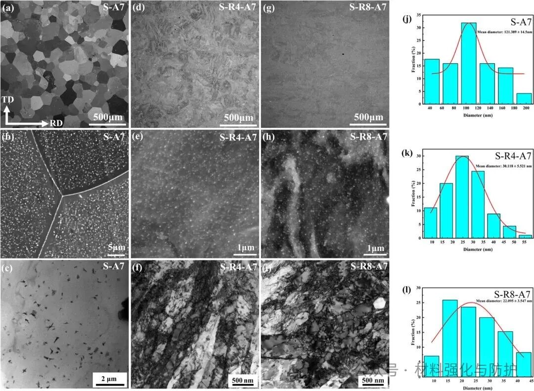 团队将真空电弧熔炼的Fe-13.51Cr-4.73Al-2.08Mo-0.64Nb-0.65Ta合金铸锭经多道次温轧+固溶+时效处理等一系列处理,最终获得S-A7、S-R4-A7、S-R8-A7三种不同组织的样品。其中S-A7未进行轧制,再结晶后直接进行时效处理,而S-R4-A7和S-R8-A7样品的主要区别在于轧制变形量上,前者轧制累计变形量为40%,后者则为80%。随后,团队结合多尺度的微观表征手段对合金微观组织的演化进行表征,并分别在室温与400 ℃下进行拉伸实验,以及高温蠕变实验以评估合金的力学性能和高温抗蠕变性能。
