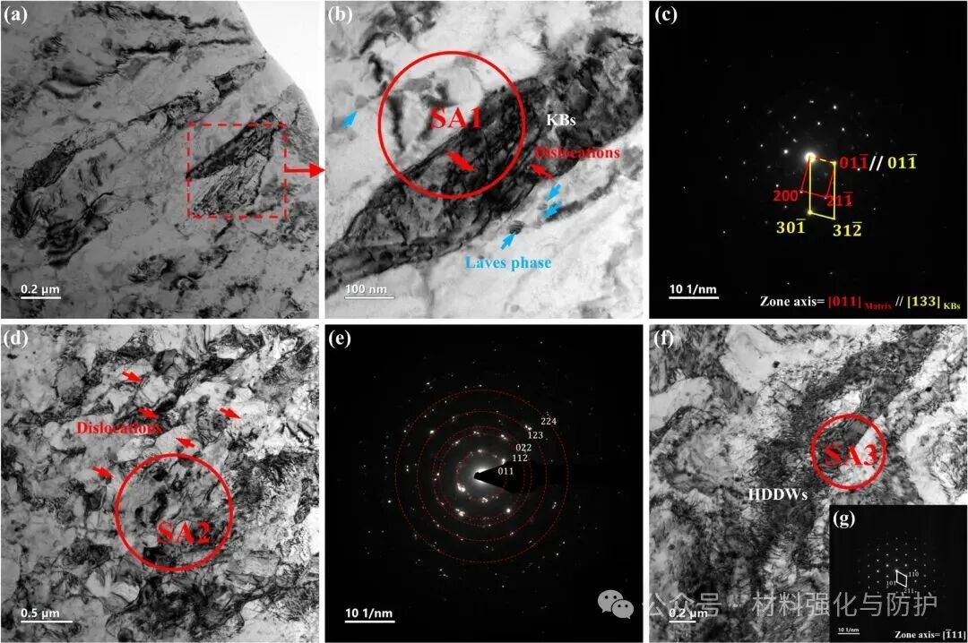 轧制变形量的增加,最直观的变化便是平均晶粒尺寸的细化,其中包括了在基体内弥散析出的Laves相,其平均尺寸从121nm减小到22nm。其次,KBs在晶粒内形成低角度晶界并逐步向高角度晶界演化,提供了持续的Hall-Petch强化作用,并且能够同时观察到纳米级KBs高密度位错强以及亚微米晶粒多尺度异质结构。