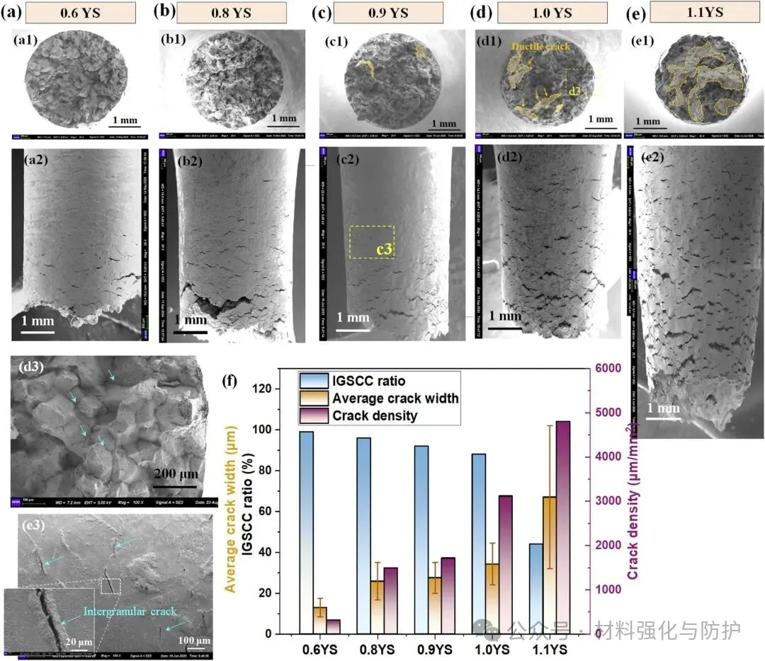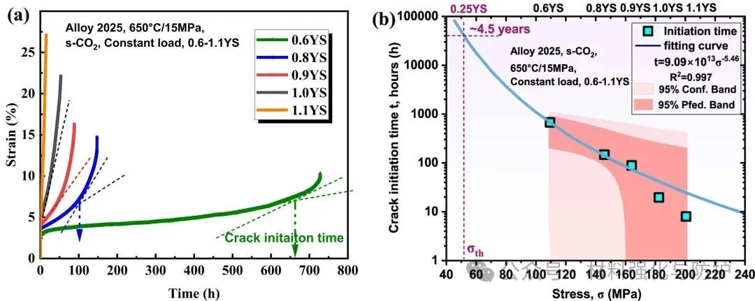 在650℃、15MPa s-CO2环境下,当应力载荷达到0.8YS时,试样在120h内就会发现裂纹萌生,且裂纹萌生多位于晶界交叉处的氧化凹陷区域,而若是载荷下降至0.6 YS下则可将这一时间延长至约665h,通过统计与拟合,团队计算得出:若工作应力保持在0.25YS以下,则该钢材制成的包壳可安全服役约4.5年。