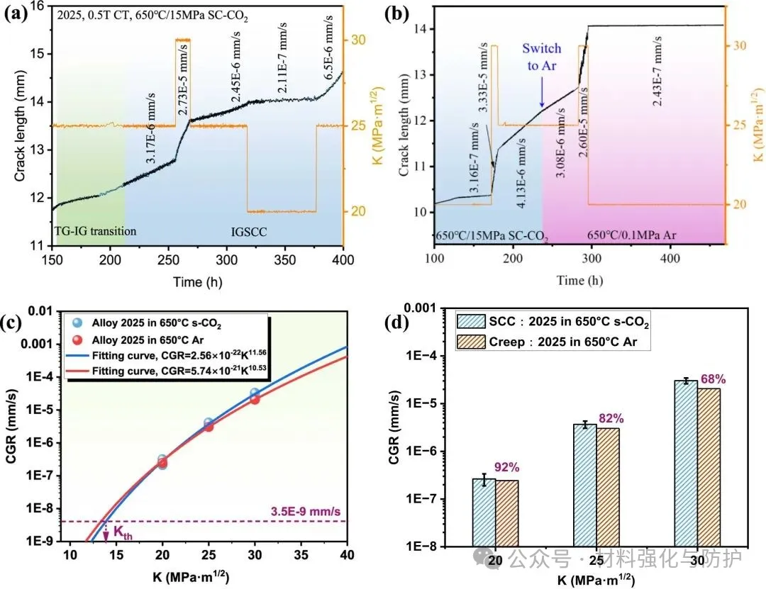 团队通过原位监测获得了在恒定应力强度因子条件下的裂纹扩展速率(CGR),发现CGR与强度因子K之间呈指数级的正相关,当K控制在13MPa√m以下时,可保证0.5mm的包壳在4.5年内的服役稳定性。此外,通过对比实验,Alloy 2025在Ar环境中的裂纹扩展速率要低于s-CO2环境,其中蠕变贡献占比在92%至68%区间内(与K呈负相关)。