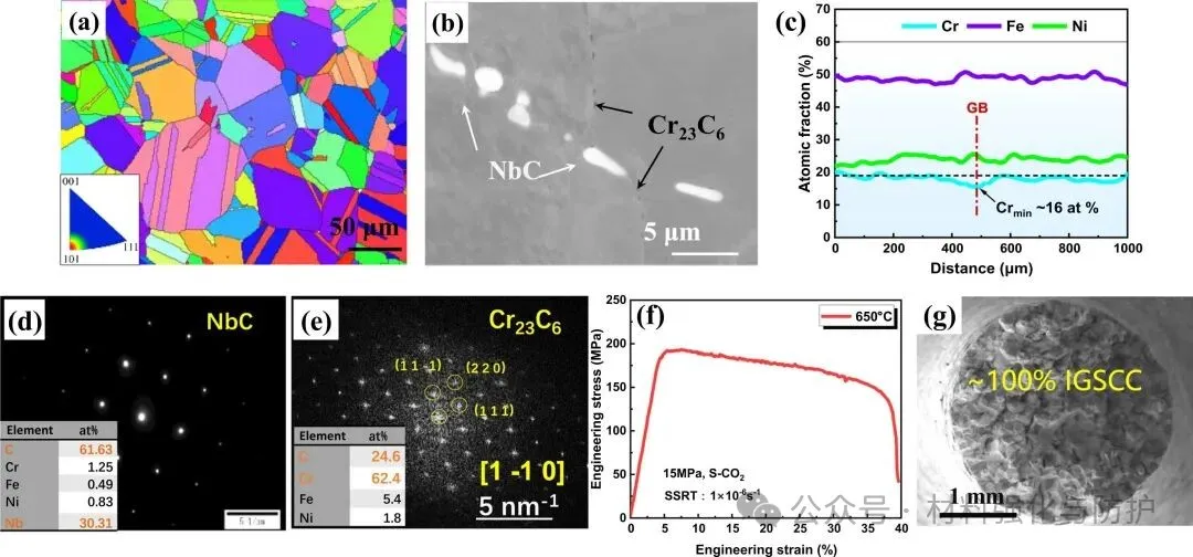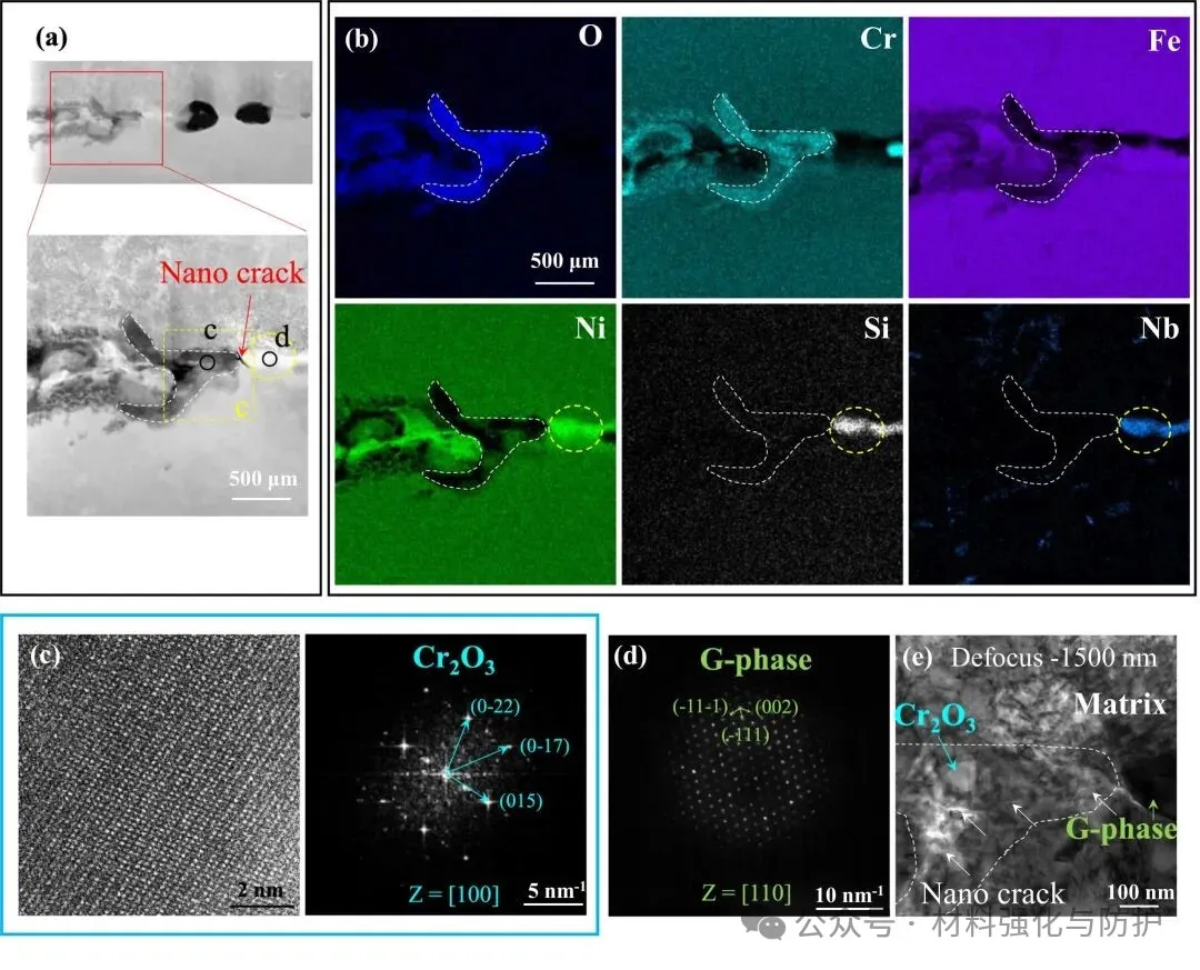 在裂纹的尖端区域发现了厚度约为130nm的Cr2O3氧化层,同时,在该氧化层的下方,团队还发现了Ni-Si-Nb富集的G相析出物及聚集的碳化物,G相与基体间存在较大的晶格失配,进而使得该区域出现局部的应力集中,并发展成为微裂纹的萌生源,同时,蠕变空洞与氧化膜交互促进裂纹向晶界内部进一步的扩展,而裂尖前沿的Cr贫化,削弱了钝化膜的稳定性,最终导致裂纹扩展破外材料的整体结构稳定性。