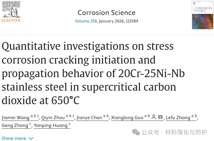腐蚀领域的国际期刊《Corrosion Science》于2025年10月6日在发表了一篇题为“Quantitative investigations on stress corrosion cracking initiation and propagation behavior of 20Cr-25Ni-Nb stainless steel in supercritical carbon dioxide at 650 ℃”的研究成果,该研究通过定量应力腐蚀开裂(SCC)实验、原位电位差监测(DCPD)及多尺度显微表征,首次系统揭示了20Cr-25Ni-Nb奥氏体不锈钢在650℃超临界CO2(s-CO2)环境下的SCC起裂与扩展机制,提出了氧化-碳化-蠕变协同作用模型,为高温核反应堆燃料包壳材料的安全服役与寿命预测提供了科学依据。通讯作者为上海交通大学的郭相龙副教授。