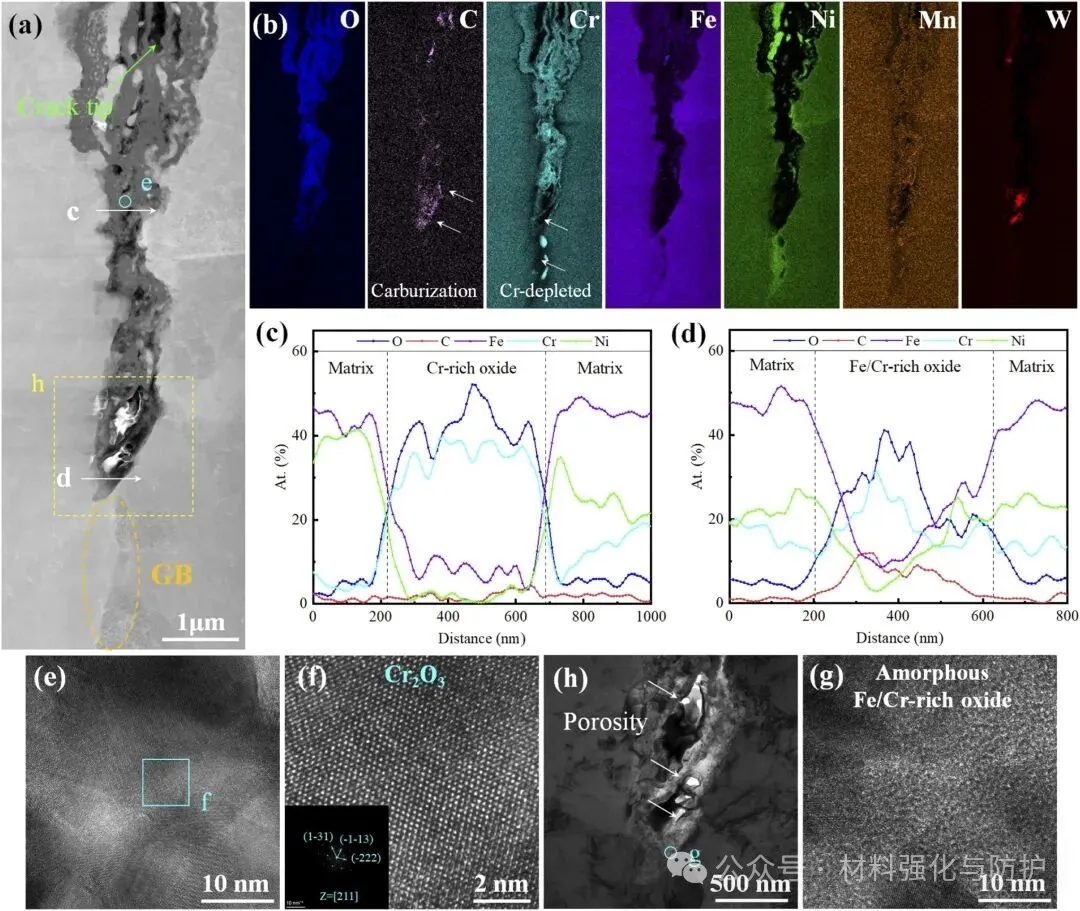 而在裂尖处形成非晶化的Cr2O3层,其中Cr含量最低仅约5wt.%,表明碳的渗入诱导了钝化膜的结构失稳,碳与氧协同作用破坏了氧化膜致密性,从而加速了裂纹萌生。