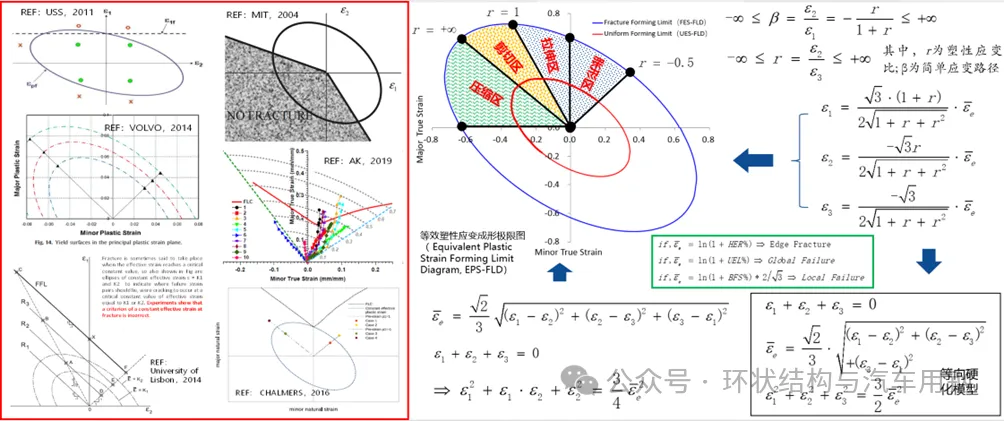 传统V-FLD不能预测边缘开裂。通过理论创新,提出了EPS-FLD,可将扩孔率、延伸率等本征参量用于计算应变空间下的失效椭圆,为预测各种成形失效模式提供了统一的判定标准。