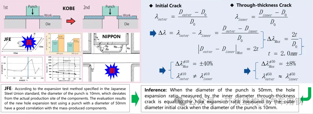 第二件,减少扩孔率测定指标。通过增大冲孔直径,两种判定标准测定的扩孔率在数学上可以近似相等,并结合JFE的实证结果,采用内径贯穿裂纹可以替代外径初始裂纹,既延续了传统的测试习惯,又测定了真实扩孔率。