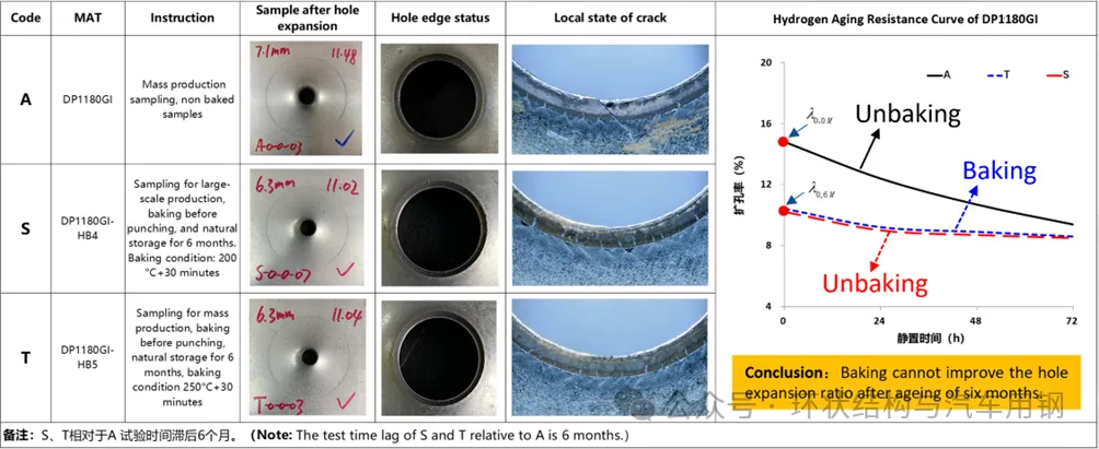 第一,烘烤能否将可扩散氢从GI镀层表面逸出?即烘烤除氢是不是一个客观事实?很遗憾,TDS测试表明锌层不是氢逸出的通道,只能从剪切边逸出。第二,冲孔后直接烘烤,会加速可扩散氢从剪切边逸出,扩孔率是否会增加?很遗憾,新扩孔测试表明扩孔率不升反降。