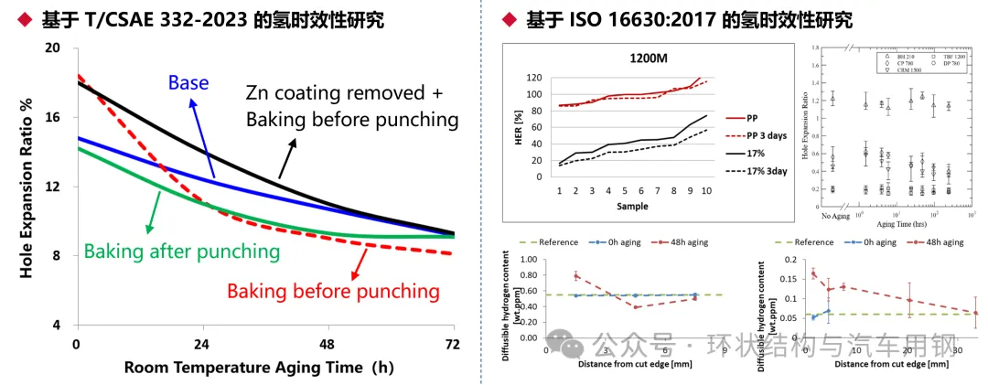 在新扩孔标准中引入冲孔后静置时间研究氢脆,是一种非充氢的评价方法。目前,能够查阅到的文献非常少,原因有两:一是,概念理解偏差,日本人认为剪切边延迟开裂跟加工硬化相关,对了一半,但关键是另一半,加工硬化不影响剪切边时效性;二是,采用ISO扩孔标准测不出有规律的曲线,新扩孔标准则可以,因此,西方人从观念和手段均不具备研究氢时效性的条件。
